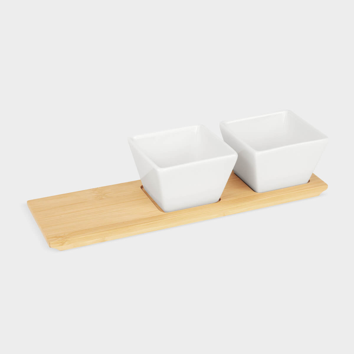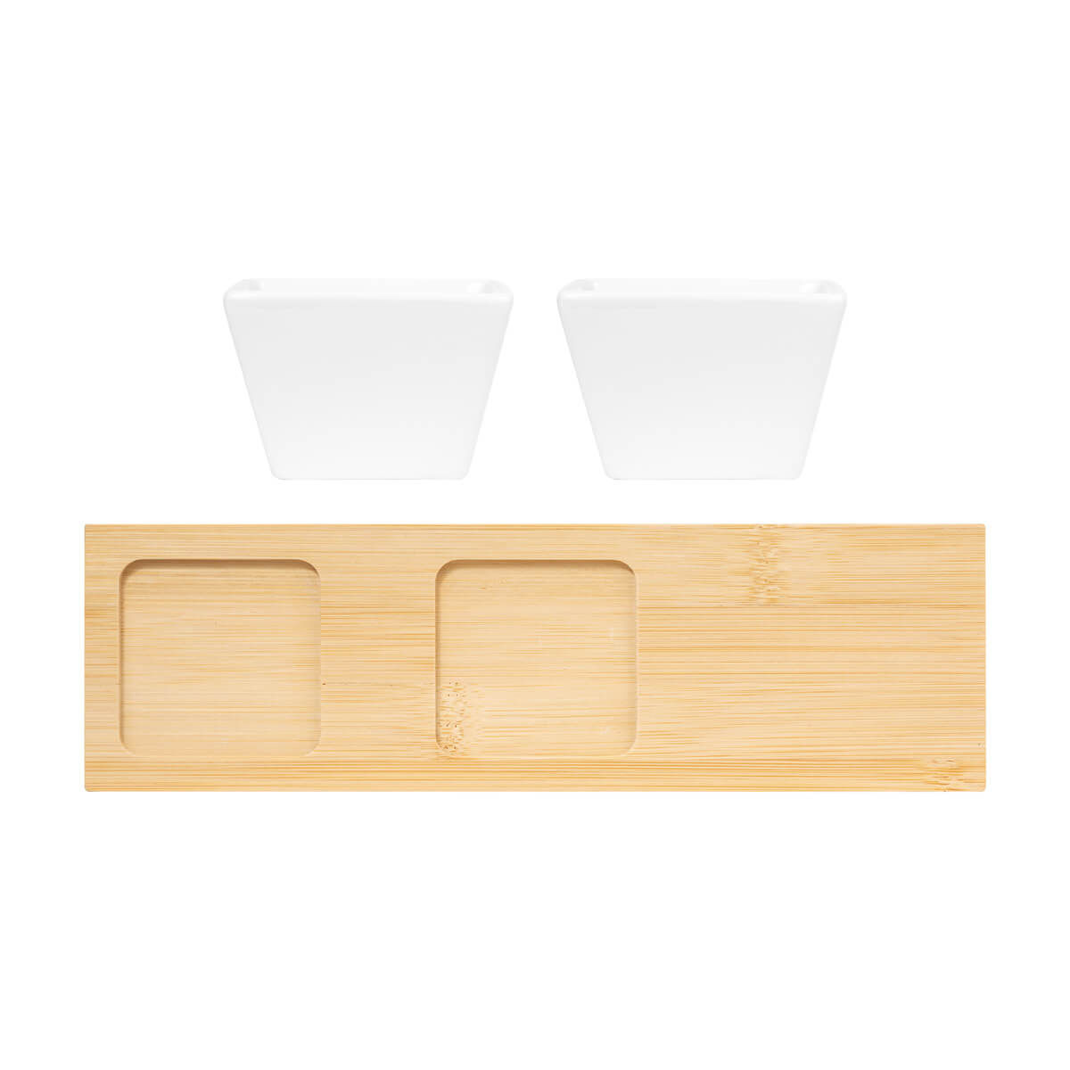 Botanero con base de bambú y dos contenedores de cerámica. Perfectos para servir botanas, dips o salsas con estilo. Ideal para reuniones, cenas o cualquier ocasión donde el diseño y la practicidad se encuentren. Incluye caja individual. El bambú es un producto natural el cual puede presentar variaciones en tonalidades y vetas. – KTC 976
