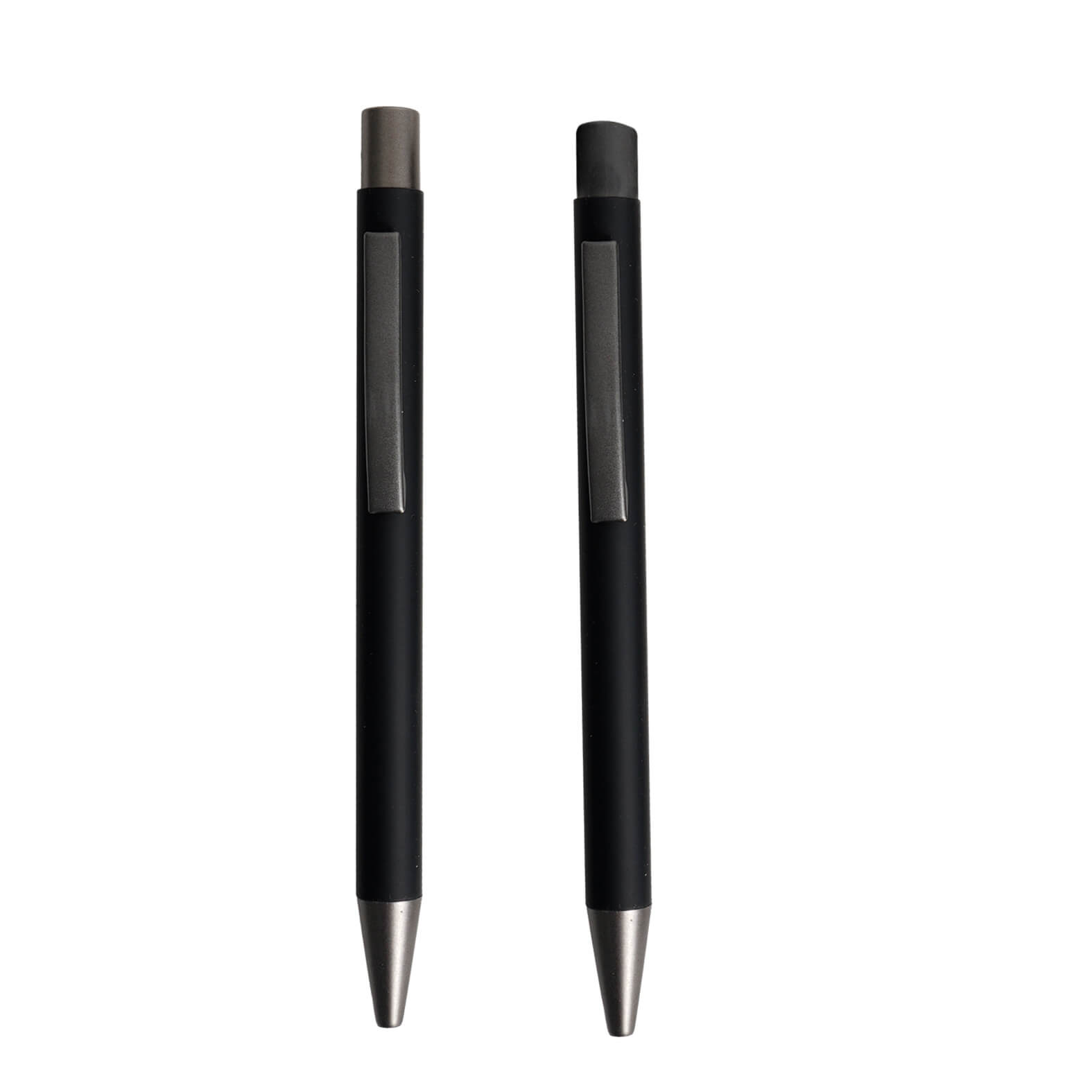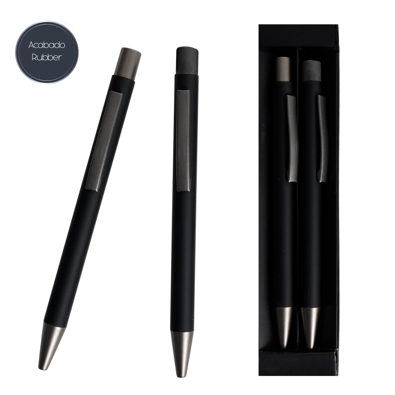 Bolígrafo y lapicero metálicos con acabado rubber, clip y mecanismo de click. Incluye estuche