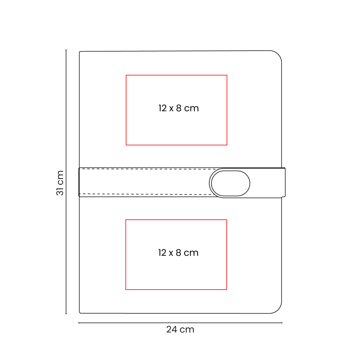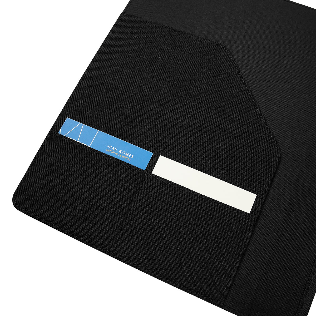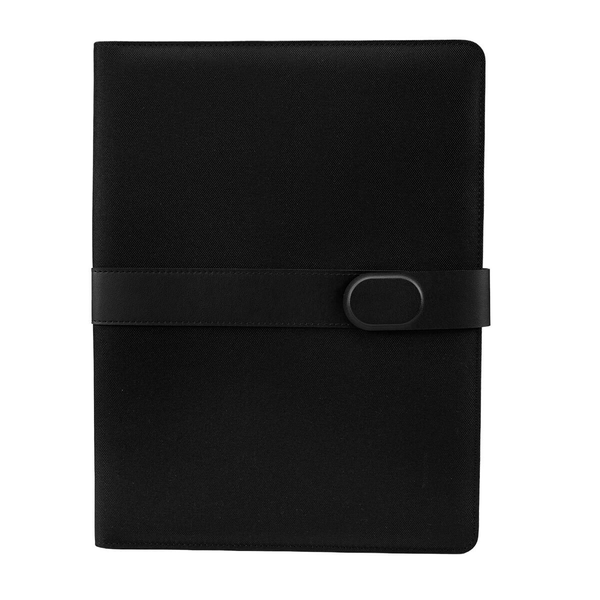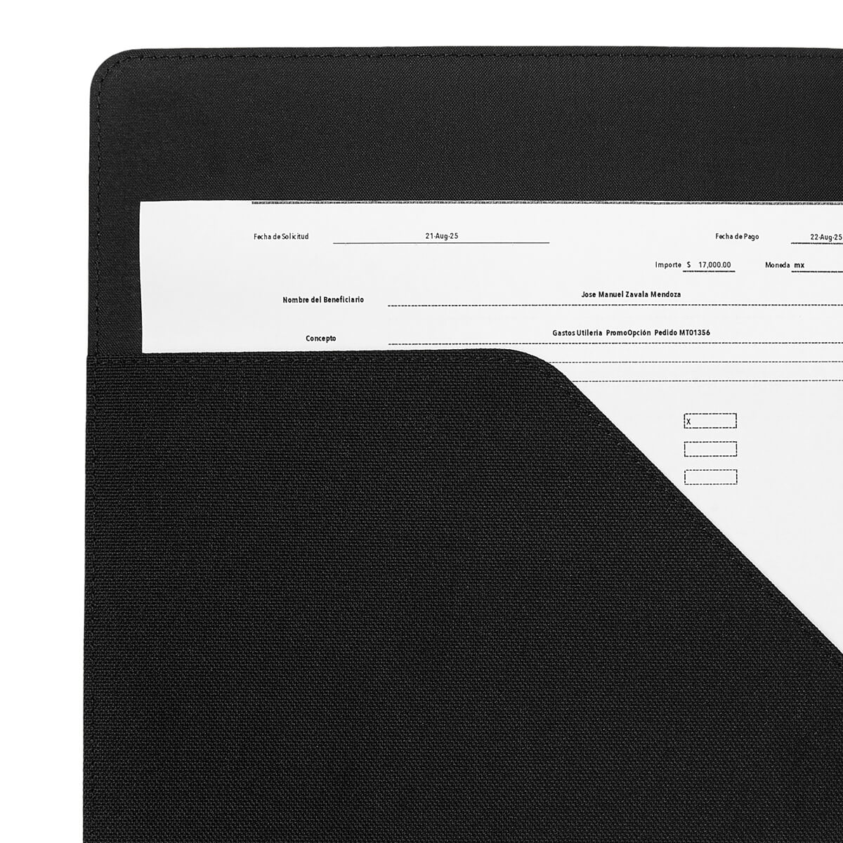 Carpeta con block de notas. Incluye 40 hojas con línea a raya para facilitar la escritura ordenada. En su interior cuenta con compartimentos para organizar documentos y un elástico interno para bolígrafo. Incluye cintillo con cierre imantado. – M 80772