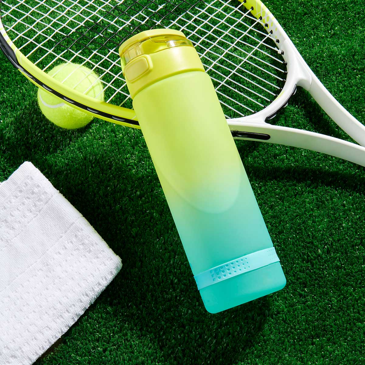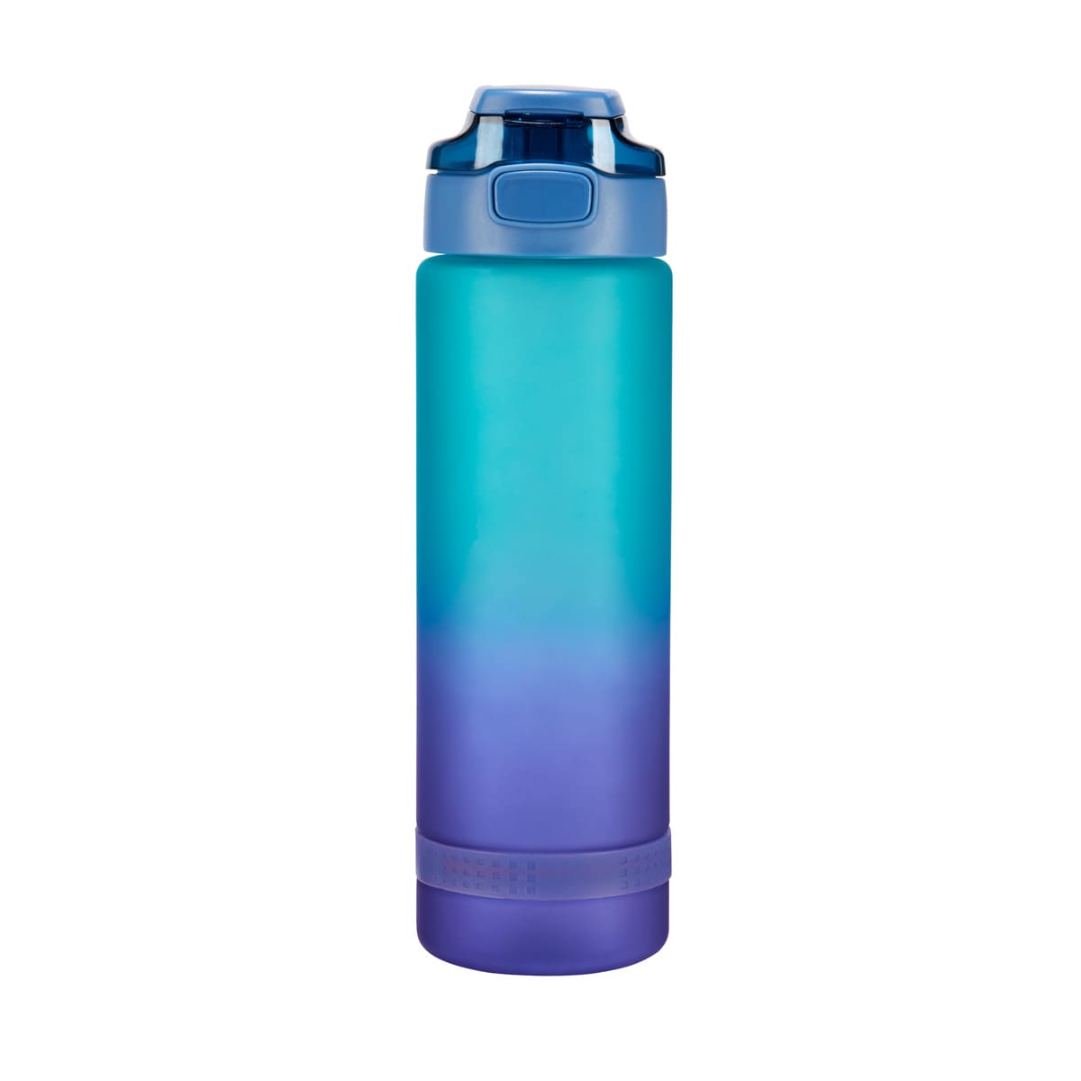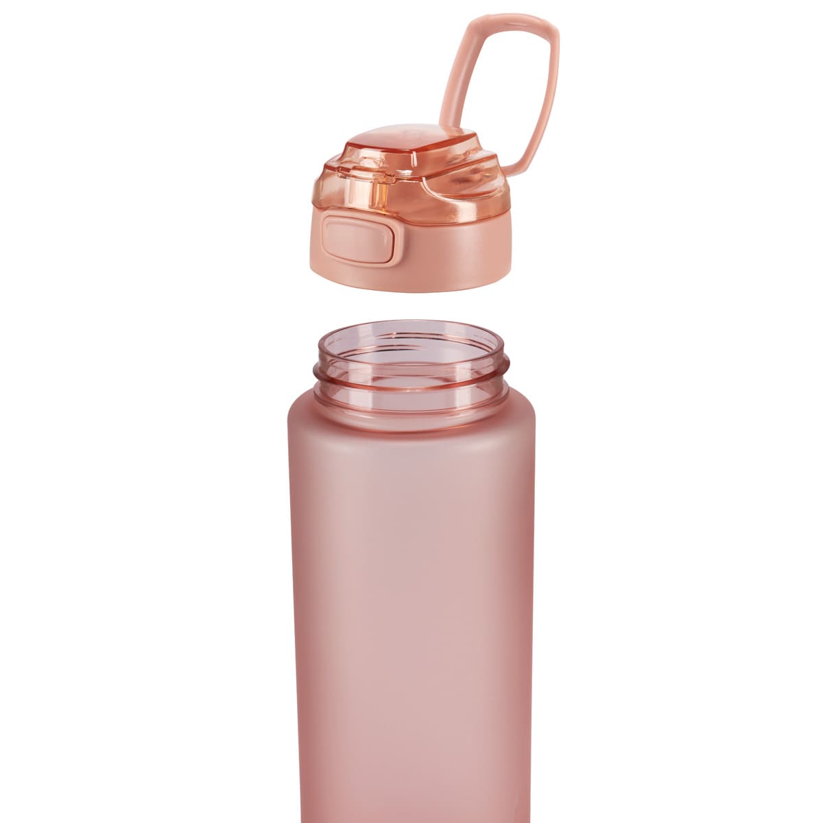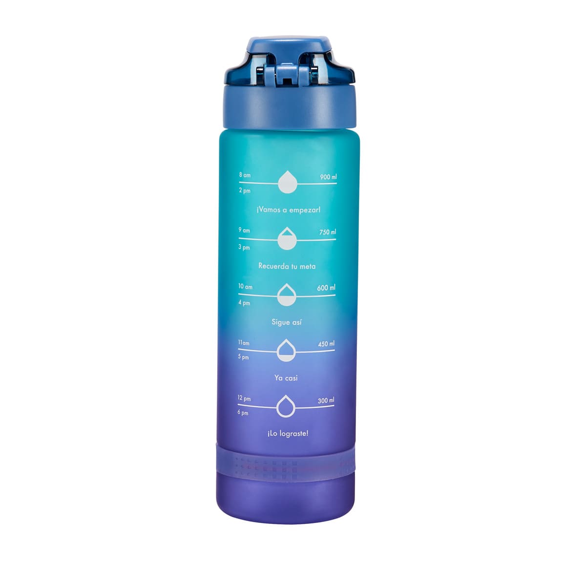 Tapa de plástico con cierre de rosca hermética y boquilla. Sobretapa push con botón y asa plegable. Cuerpo con terminado tipo rubber, suave al tacto. Cuenta con un detalle de silicón en la parte inferior. Incluye marcador de mililitros y horas lo que te permite medir fácilmente la cantidad de agua que bebes a lo largo del día y llevar un control de tu hidratación. Incluye caja individual. – ANF 077
