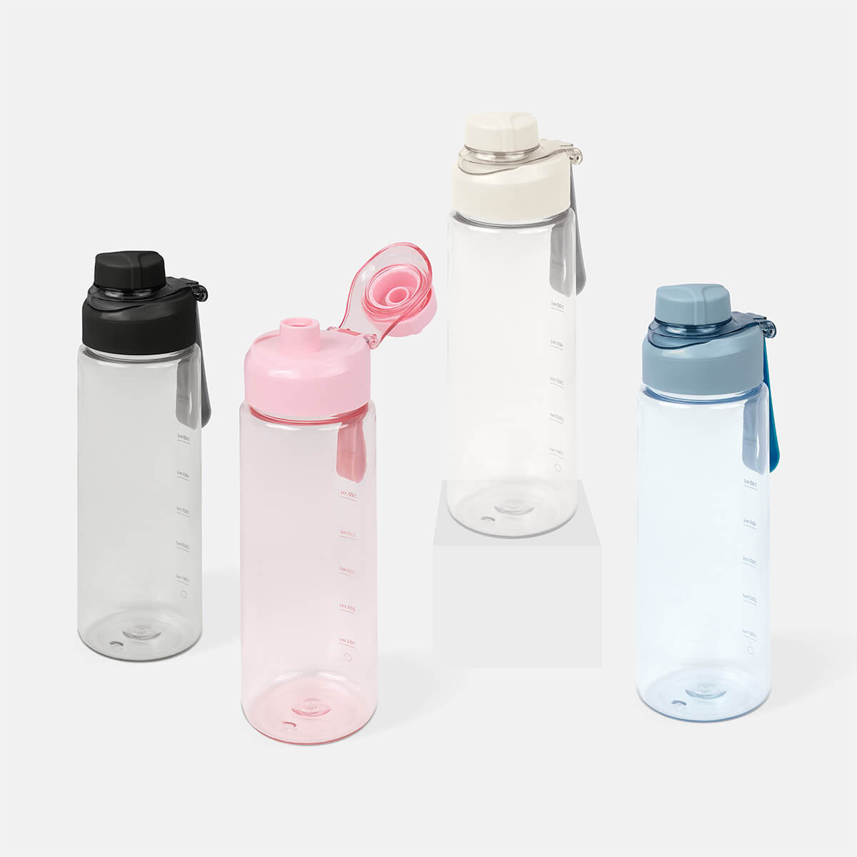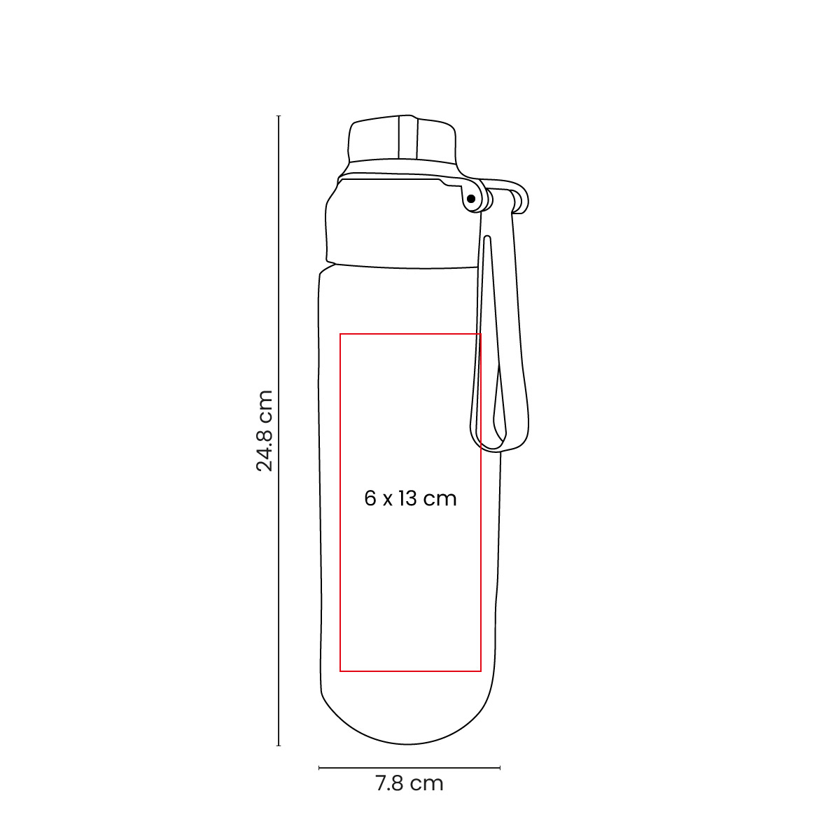 Cilindro de plástico de una pared. Tapa de plástico con sistema de rosca y sobretapa para la boquilla. Cuenta con asa de silicón para llevarlo cómodamente e indicador de mililitros. Perfecto para el día a día. – ANF 087
