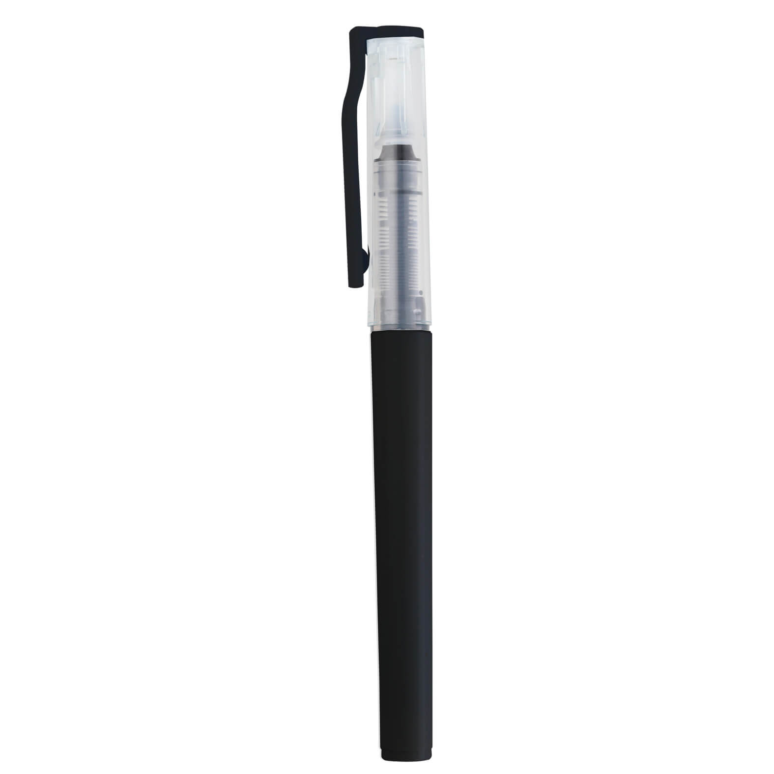 Bolígrafo de plástico con tinta negra de gel, tapa traslúcida y clip de plástico.
