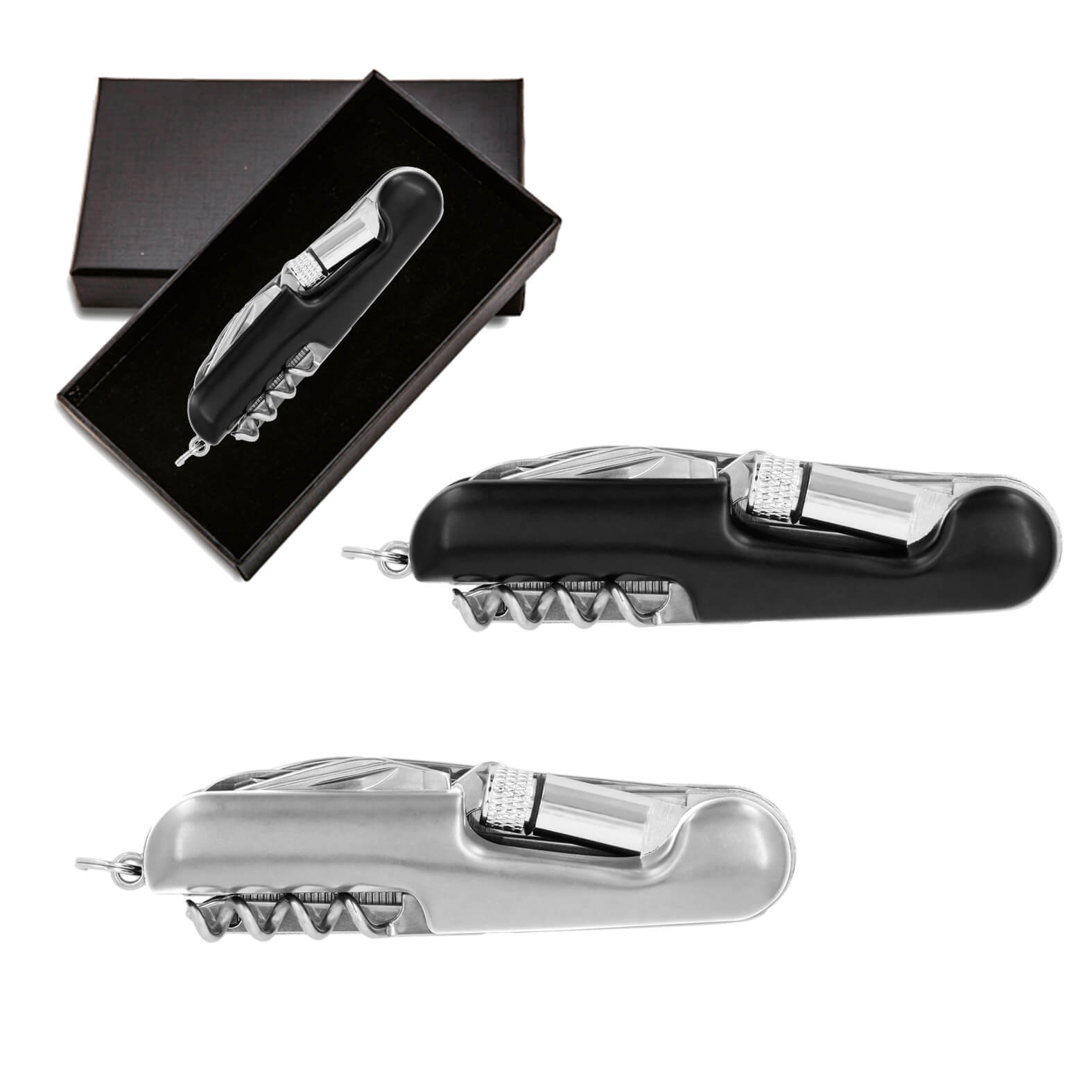 Navaja metálica multiusos con 12 funciones que contiene: lámpara de 1 LED con 3 baterías incluidas, tijeras, destapador de punta y plana, 2 navajas, sierra, desarmador de cruz, lima, enhebrador de agujas y un sacacorcho, cuenta con arillo para usar como llavero. Incluye estuche.