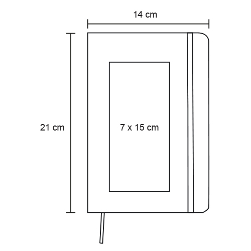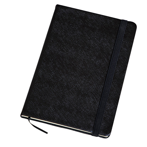 Libreta con pasta texturizada de apariencia metálica, separador y banda elástica para sujetar cubierta. Con 90 hojas rayadas.