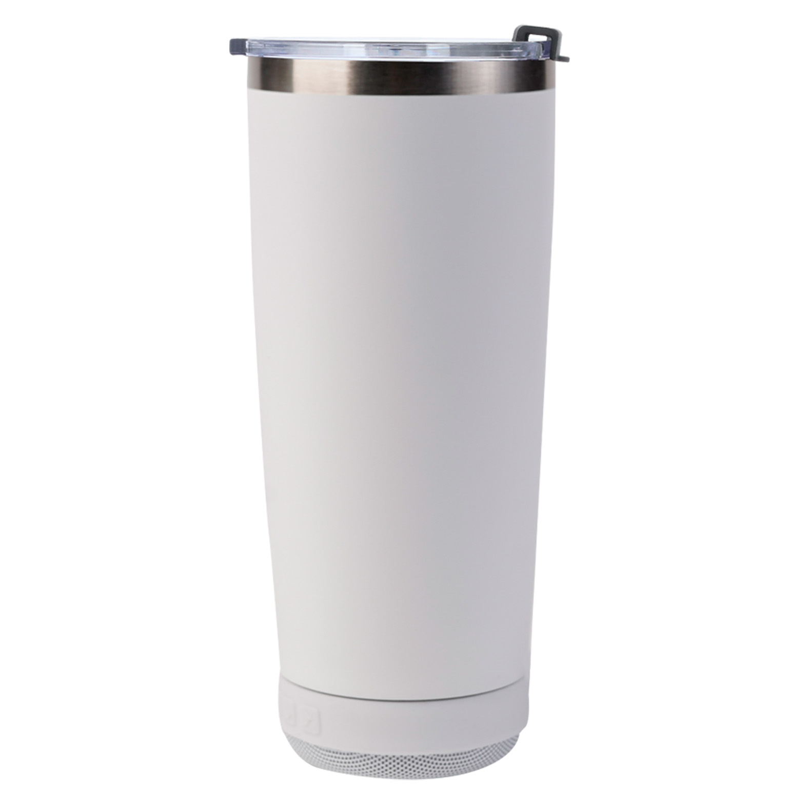 Termo aislado al vacío con doble pared de acero inoxidable, acabado plastic painting, equipado con bocina Bluetooth que cuenta con controles de volumen, botón de reproducción, efectos de luz y puerto para tarjeta TF. Incluye cable tipo C. La bocina es removible de la base del termo.