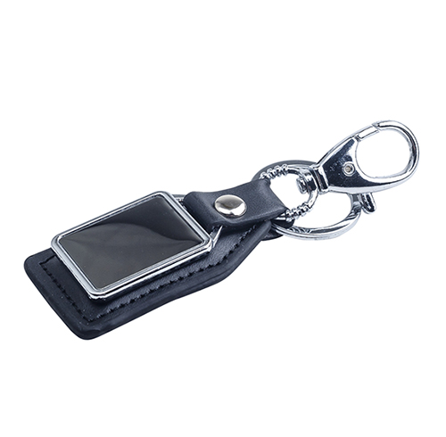 Llavero metálico de curpiel con orillas bordadas, placa metálica, aro reforzado y broche para mayor sujeción.