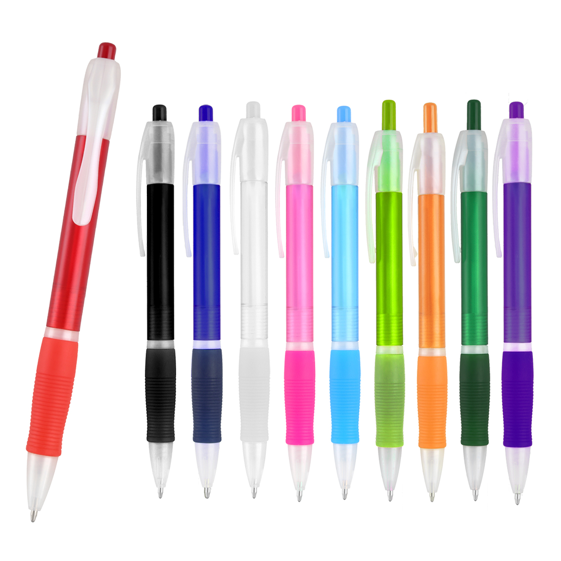 Bolígrafo de plástico con clip frozen y grip de goma.