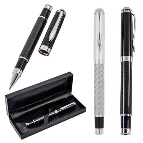 Bolígrafo de fibra de carbono con tapa metálica. Incluye estuche. Medidas de estuche: 17.2 x 2.7 x 6.2 cm