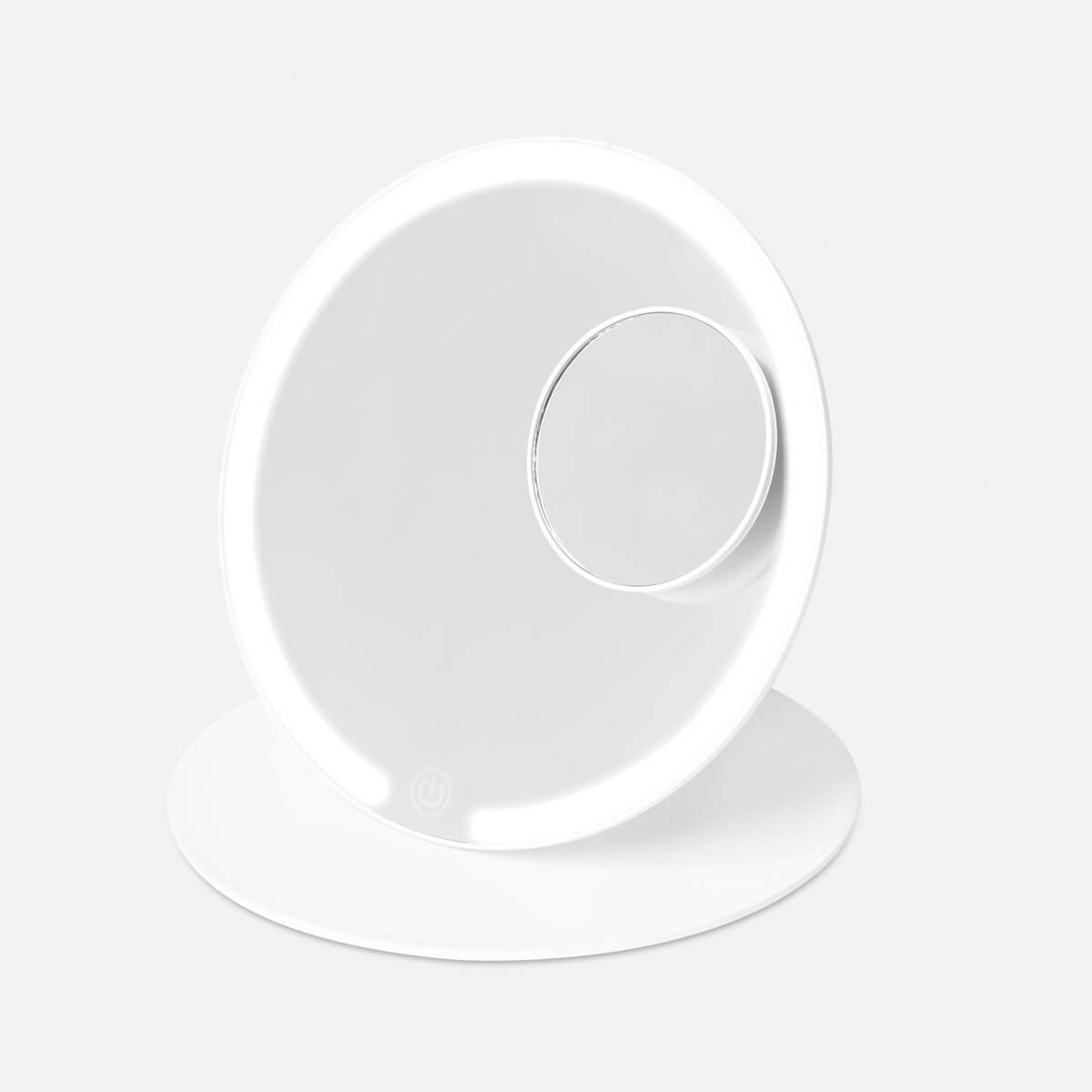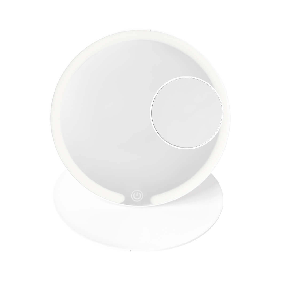 Espejo plegable con iluminación LED con 3 modos de luz: fría, natural y cálida. Pulsando el botón del sensor táctil one touch. Duración de luz de 3.5 hrs. Incluye espejo magnético de aumento 5x, puerto de carga y cable tipo C. – DAM 077