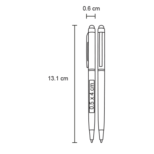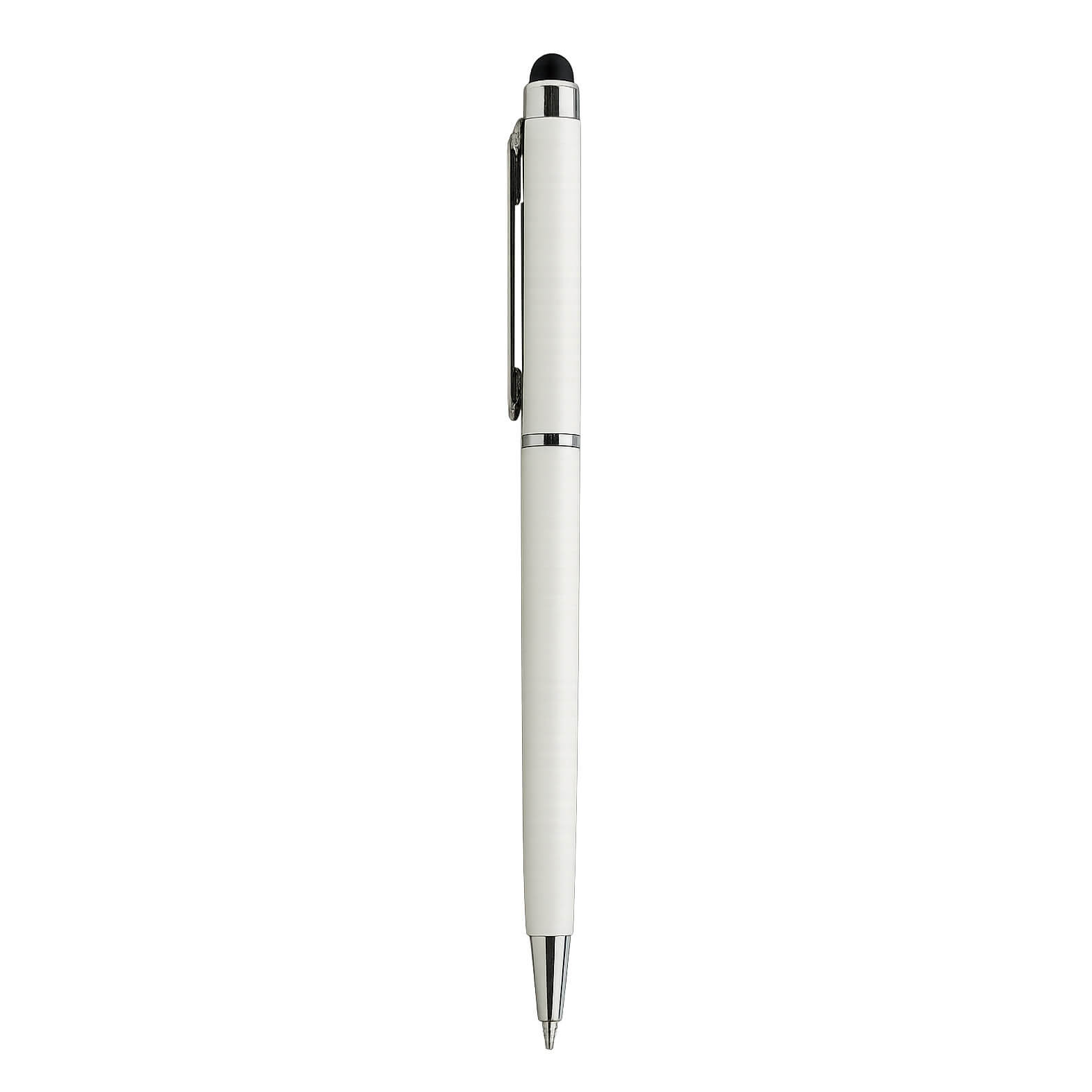 Bolígrafo de plástico con mecanismo retráctil, con apariencia metálica, clip metálico y goma touch screen.