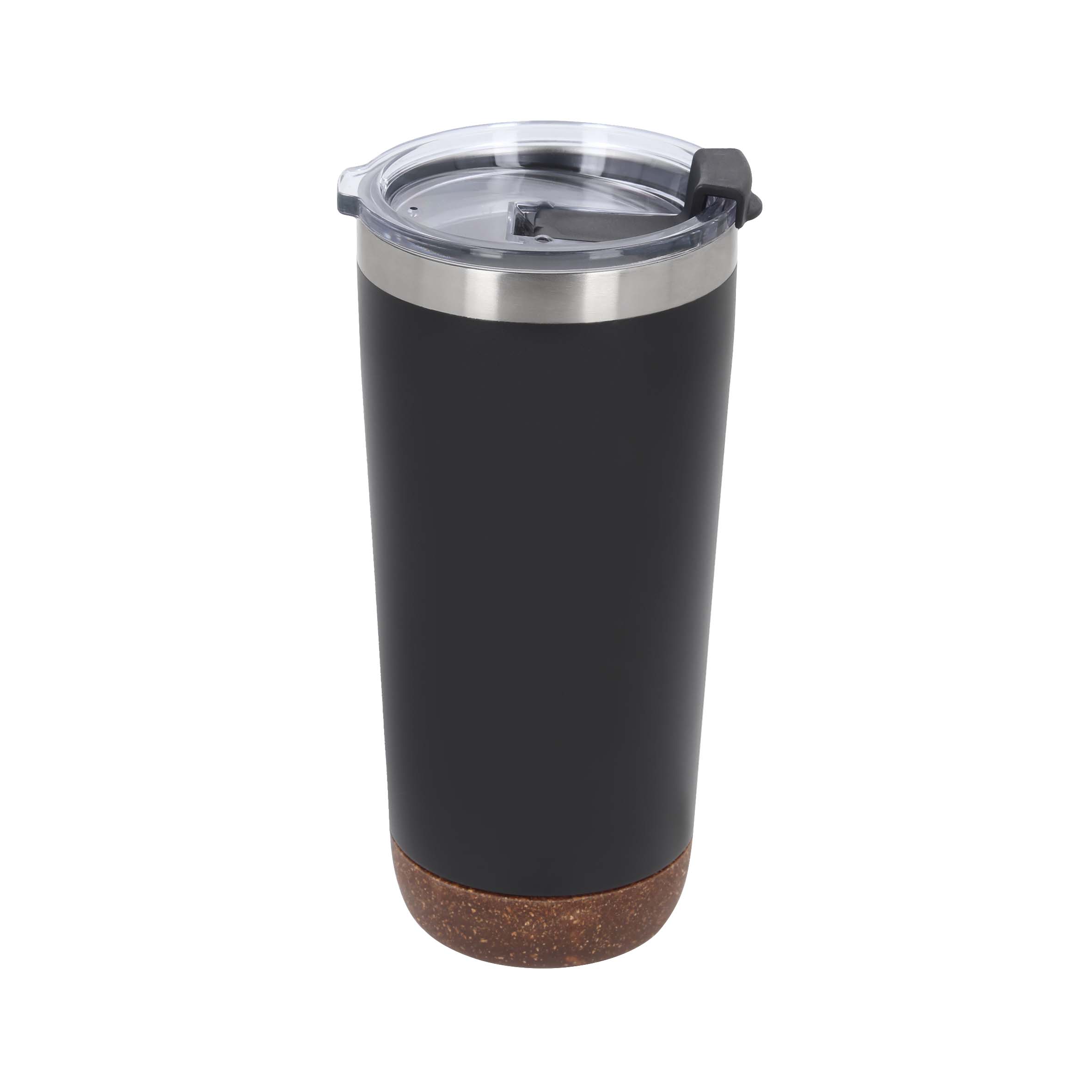 Termo insulado al vacío con doble pared de acero inoxidable, acabado rugoso, base de corcho y tapa de cierre a presión.