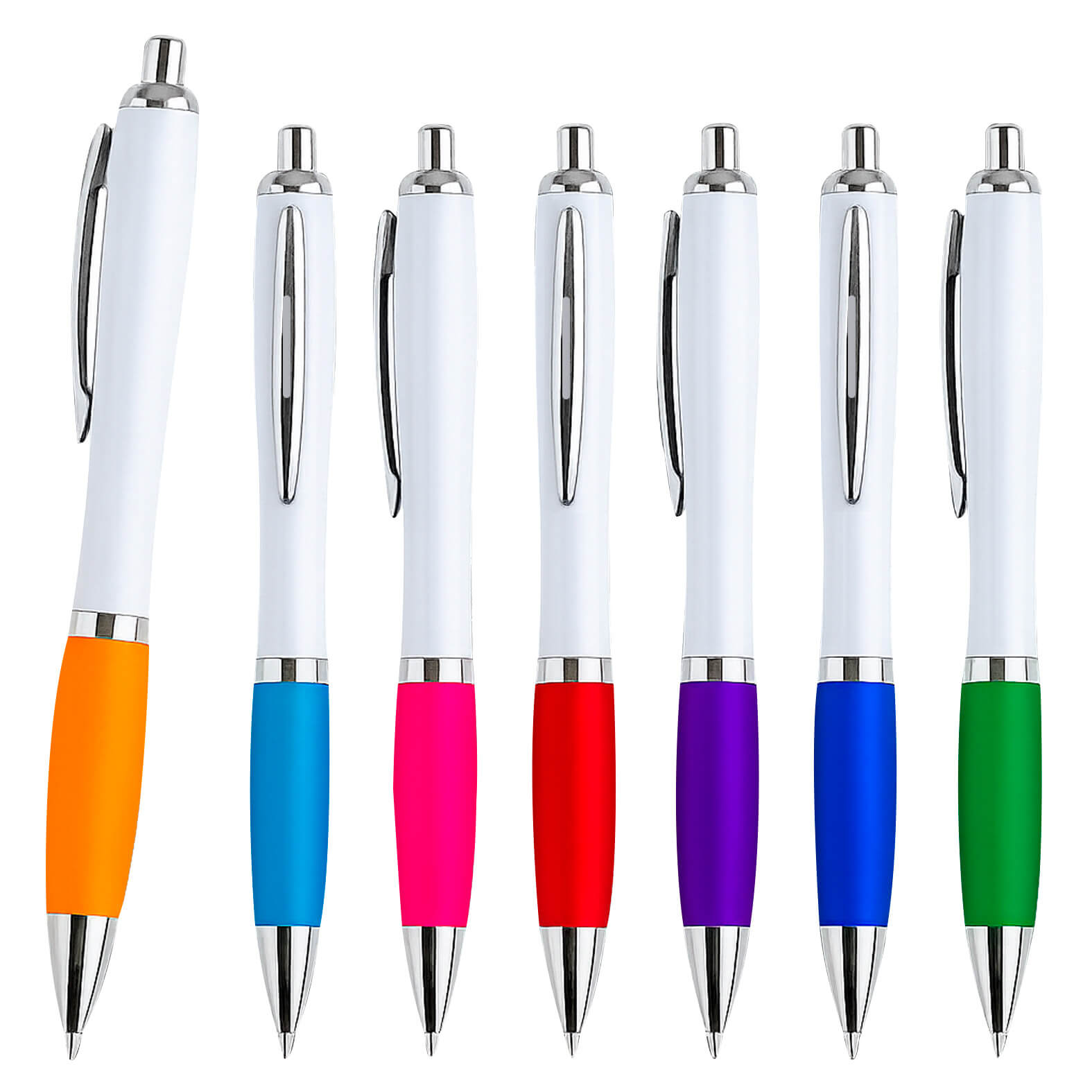 Bolígrafo de plástico con clip metálico y grip de goma.