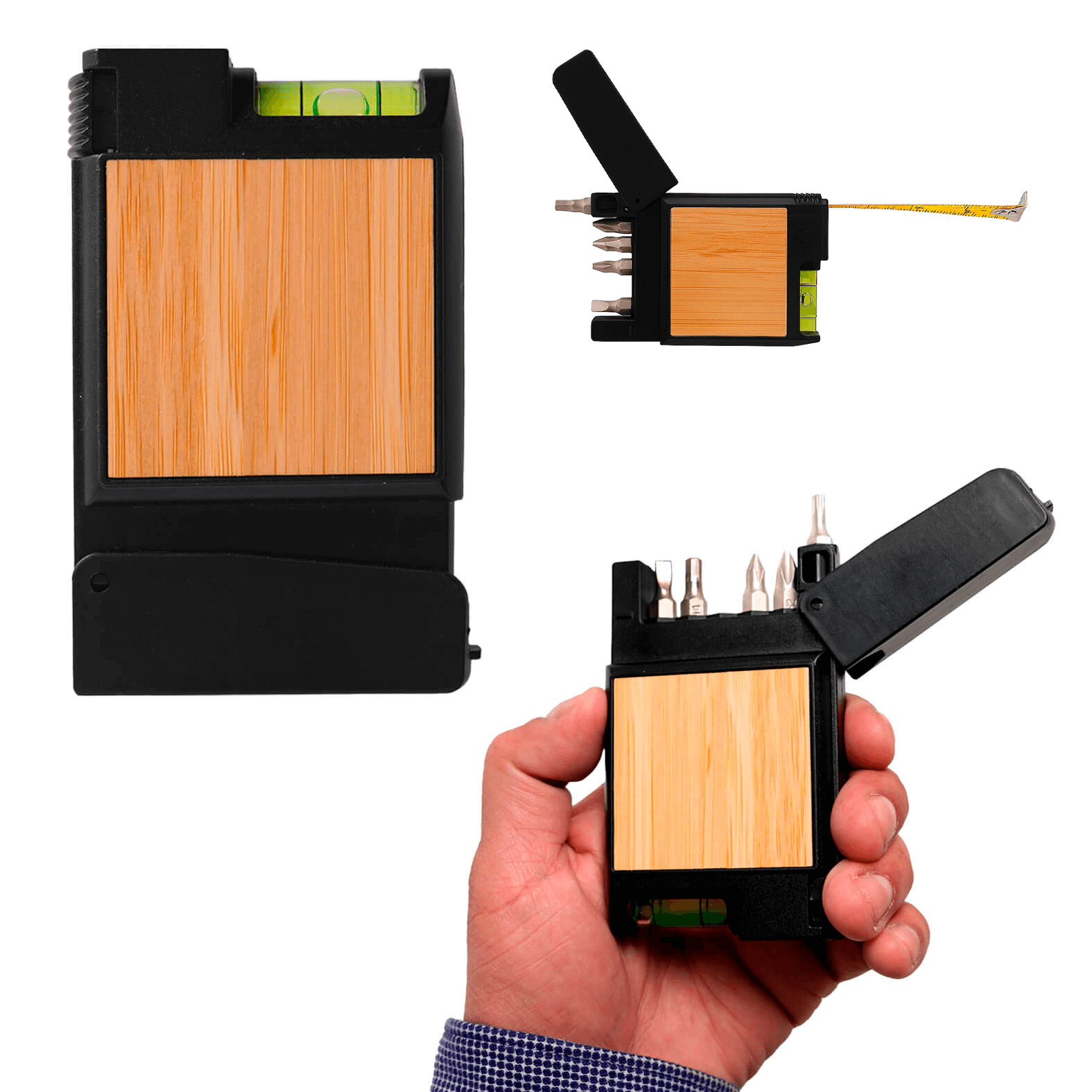 Set de herramientas con detalle de bambú. Incluye nivel de burbuja, flexómetro y desarmador con 6 puntas intercambiables.