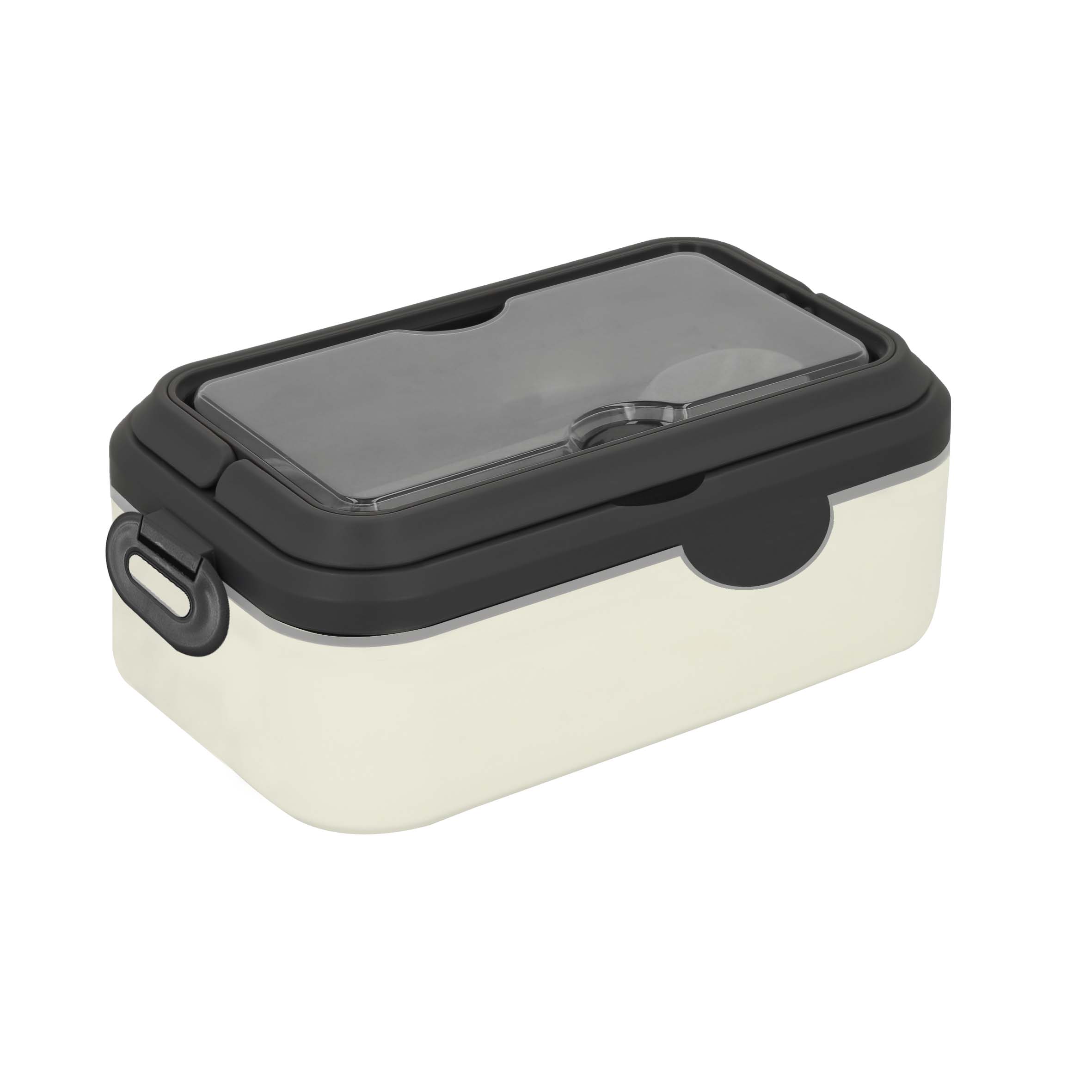 Contenedor de alimentos de plástico, con asas superiores, clips de seguridad y compartimento para cuchara y tenedor.