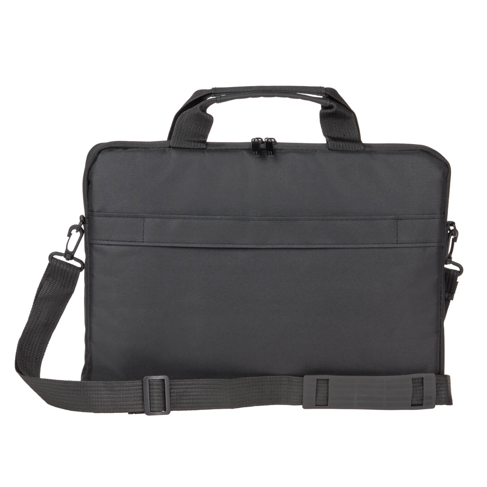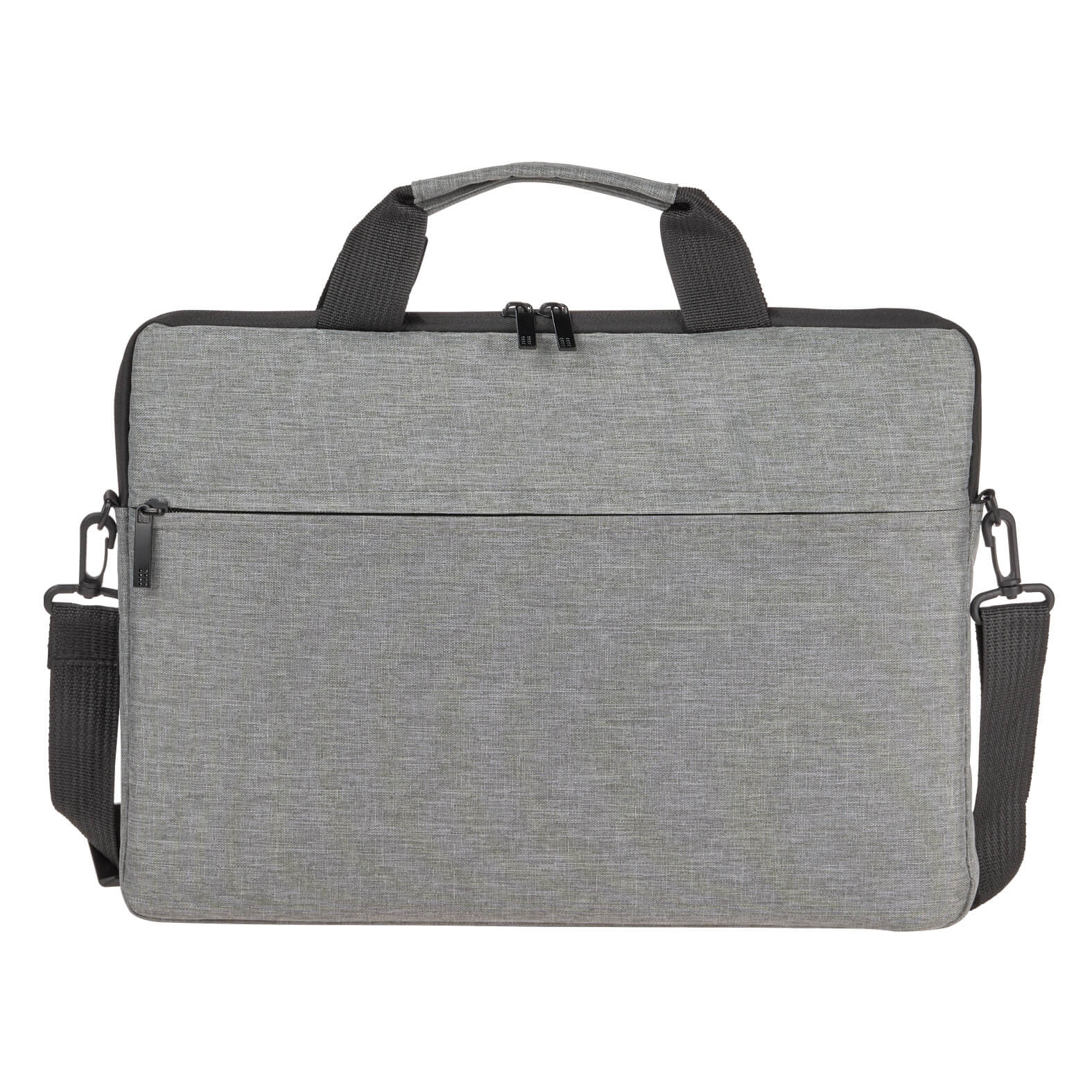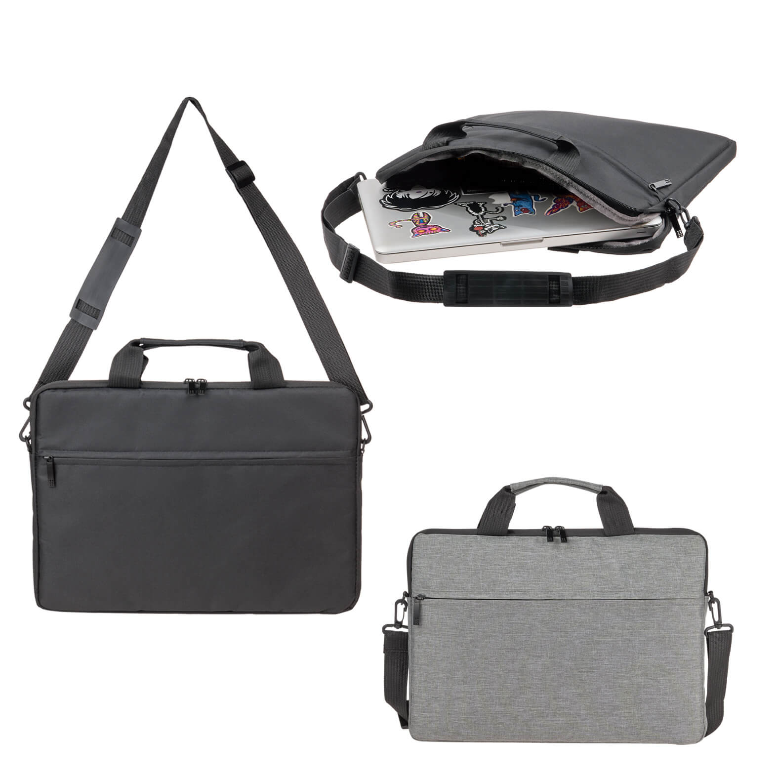 Portafolio con un compartimento principal afelpado para laptop de hasta 15″, bolsa frontal con cierre, banda para carry-on, asas y correa ajustable.