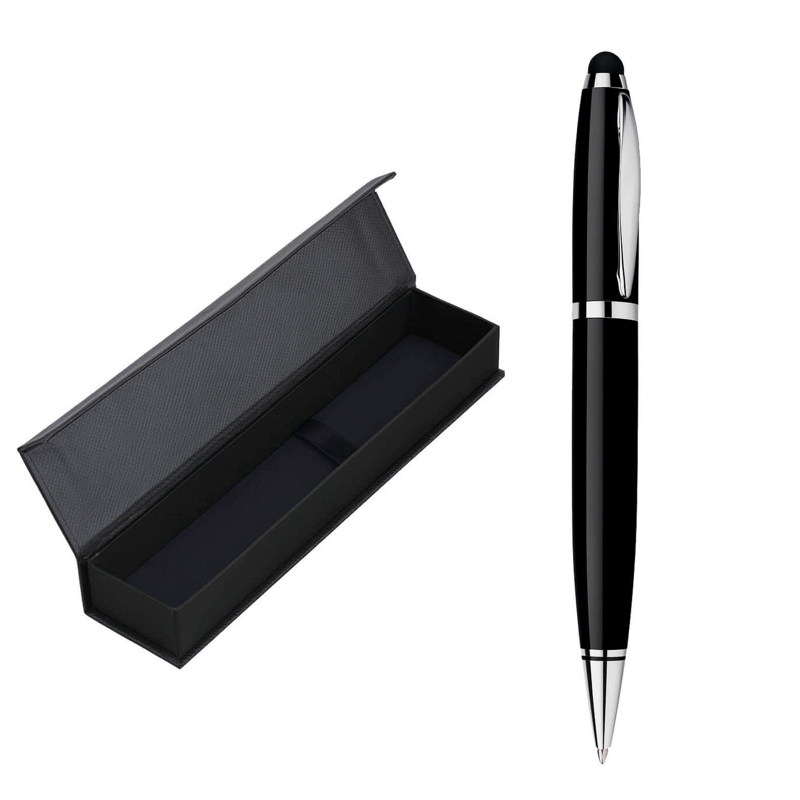 Bolígrafo metálico con goma touch screen y estuche de cierre magnético.