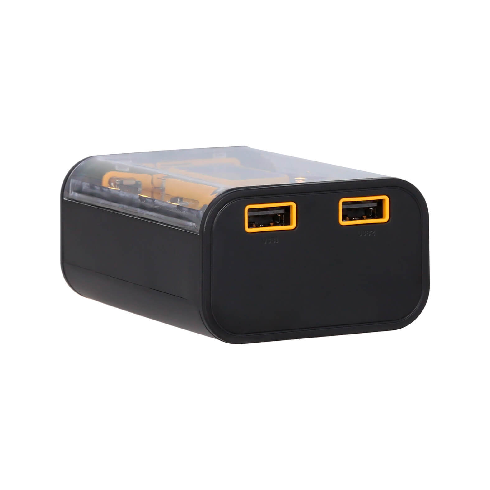 Power Bank transparente de 6,000 mAh con 2 puertos USB, 1 Micro, 1 tipo C y botón de encendido o apagado. Incluye cables de carga para dispositivos con entrada USB, lightning, tipo C y 4 tipos de luz led que sirven como lámpara.