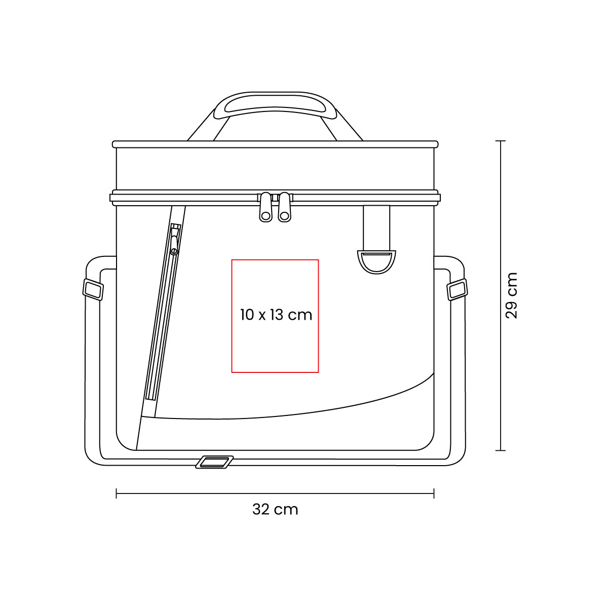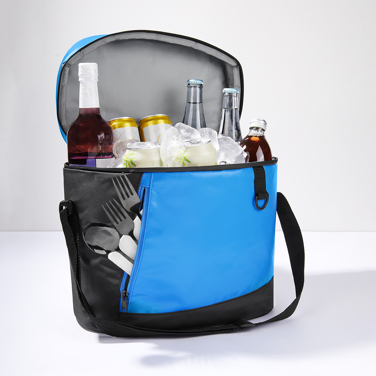 Interior y exterior plastificado impermeable. Bolsa principal y bolsillo frontal con cierre. Al frente cuenta con accesorio para colgar llaves o destapador. Incluye asa de mano y correa larga ajustable. Capacidad para 16 latas. – SIN 888