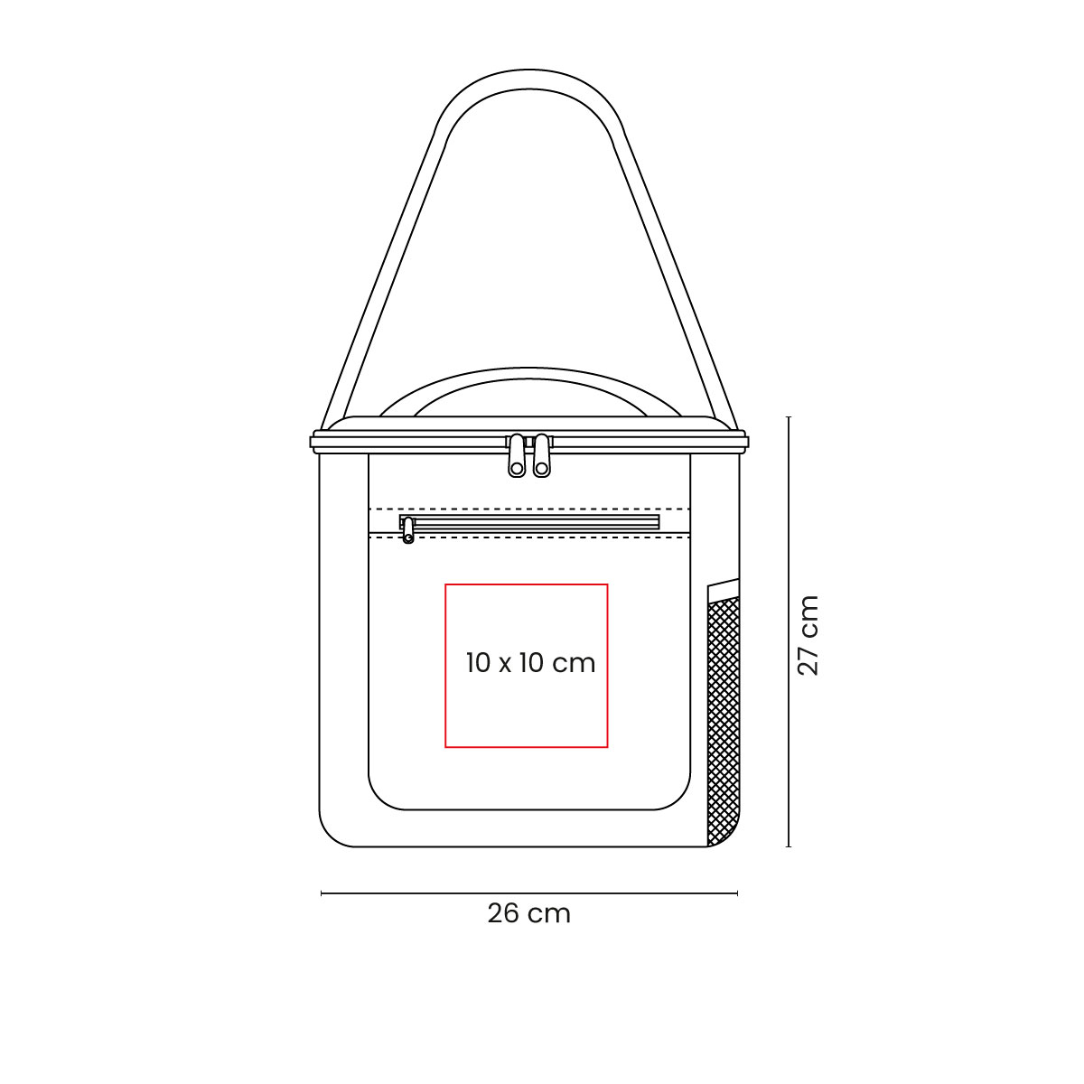 Hielera con interior plastificado impermeable. Bolsa principal y bolsa frontal con cierre. Bolsillo lateral de red. Incluye asa acolchada y correa larga ajustable. Capacidad para 24 latas. – SIN 712