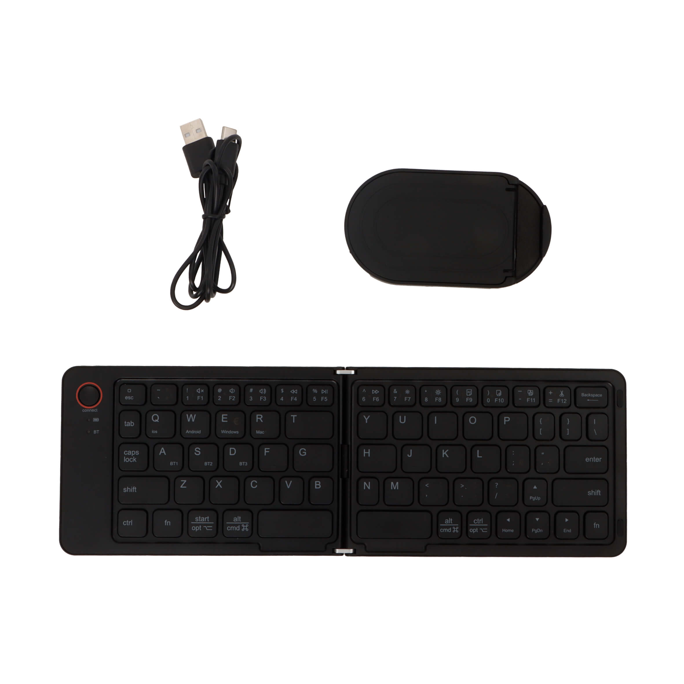Teclado inalámbrico plegable con botón de conexión. Incluye soporte y cable de carga.