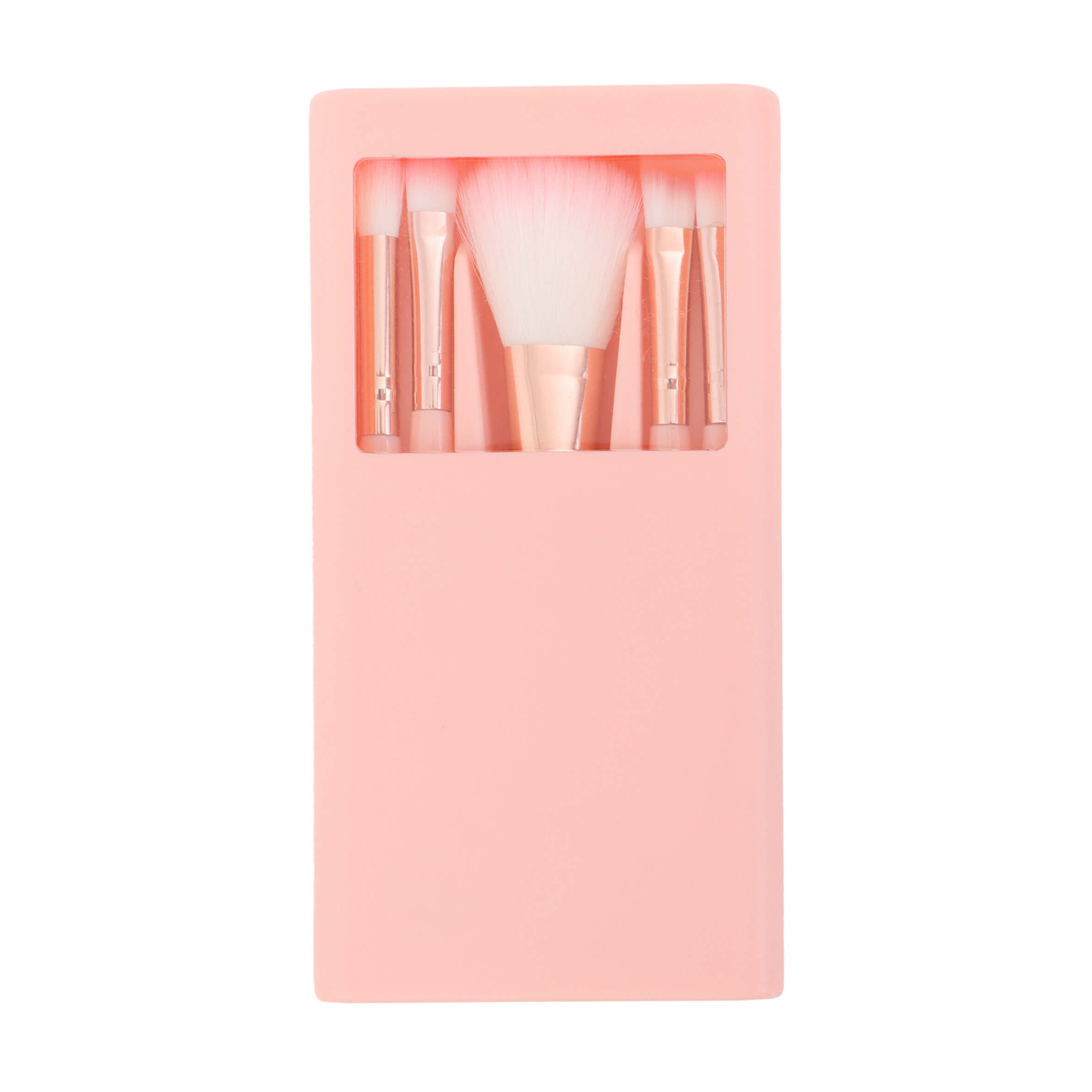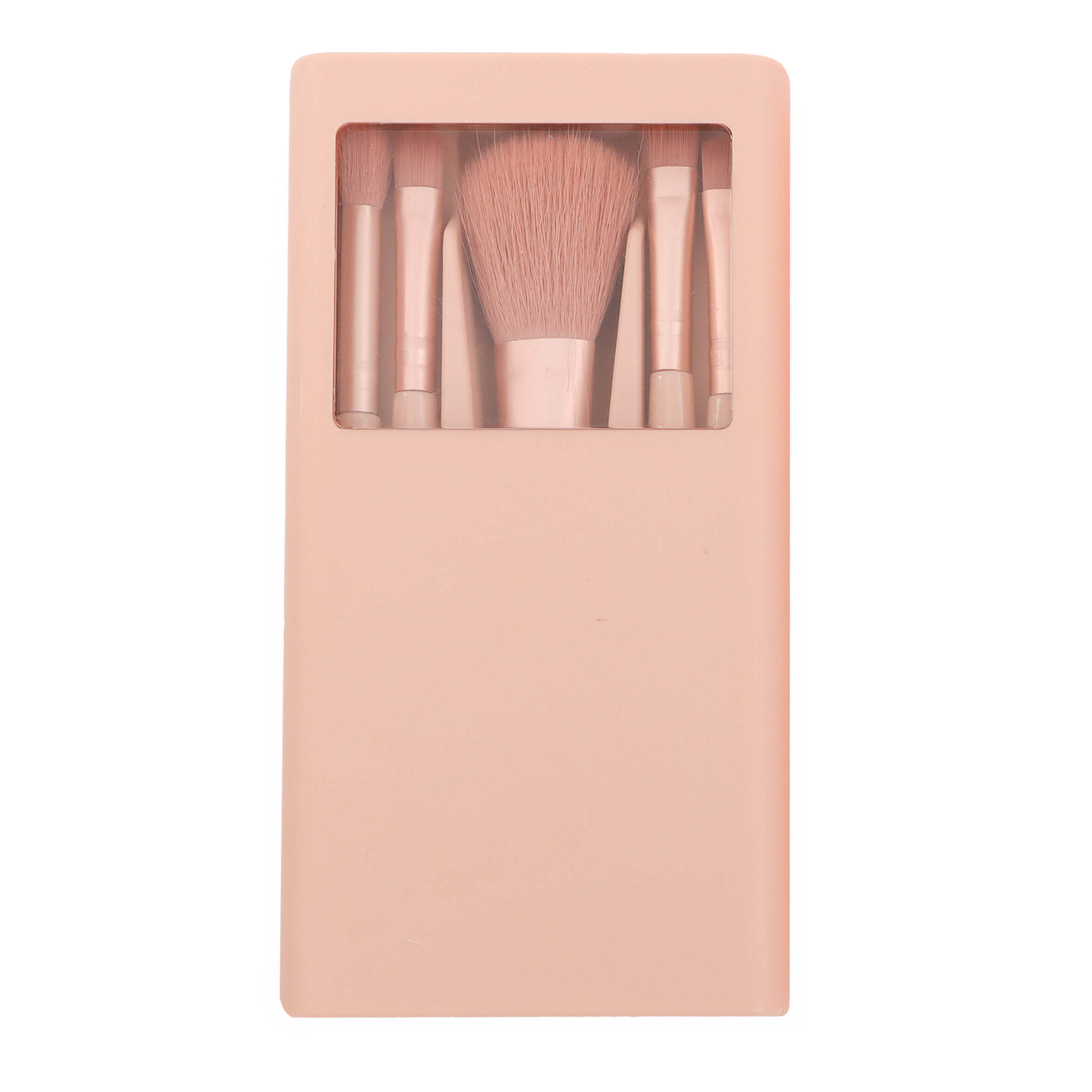 Set de 5 brochas para maquillaje con espejo y estuche de plástico.