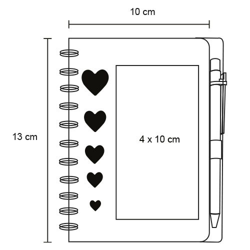 Libreta de cartón con figuras de corazón, espiral, 70 hojas rayadas y bolígrafo.