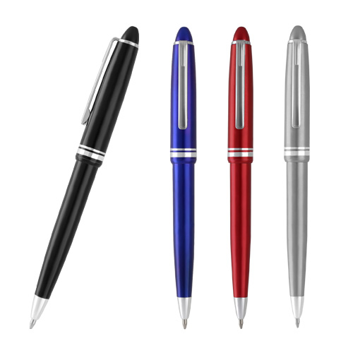 Bolígrafo de plástico con apariencia metálica y clip metálico.