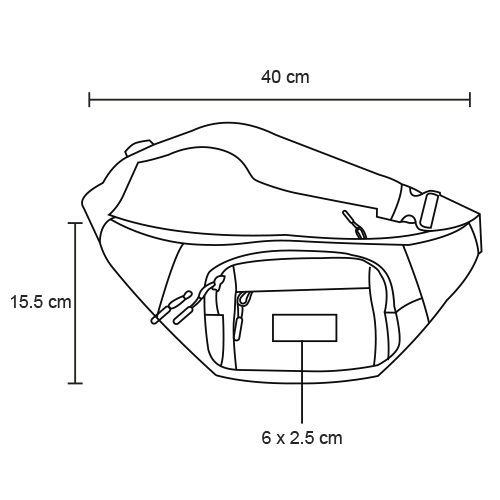Cangurera de poliéster con 4 compartimentos, cierres impermeables, cinta ajustable a la cintura y broche de seguridad a presión.