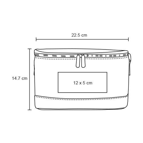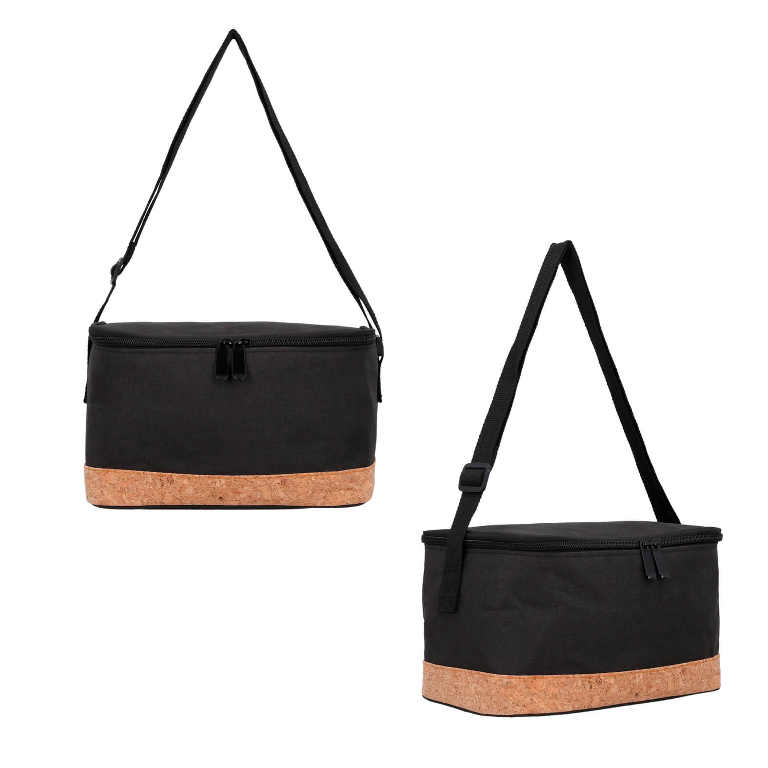 Lonchera de poliéster con interior metalizado, doble cierre, correa ajustable y detalle de corcho en la parte inferior.