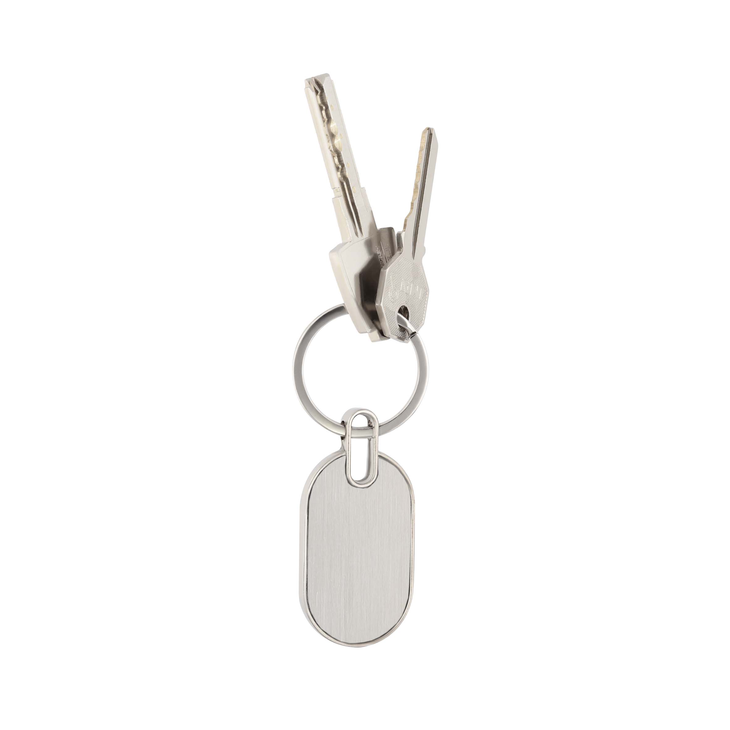 Llavero metálico de placa solida en forma de ovalo con arillo reforzado.