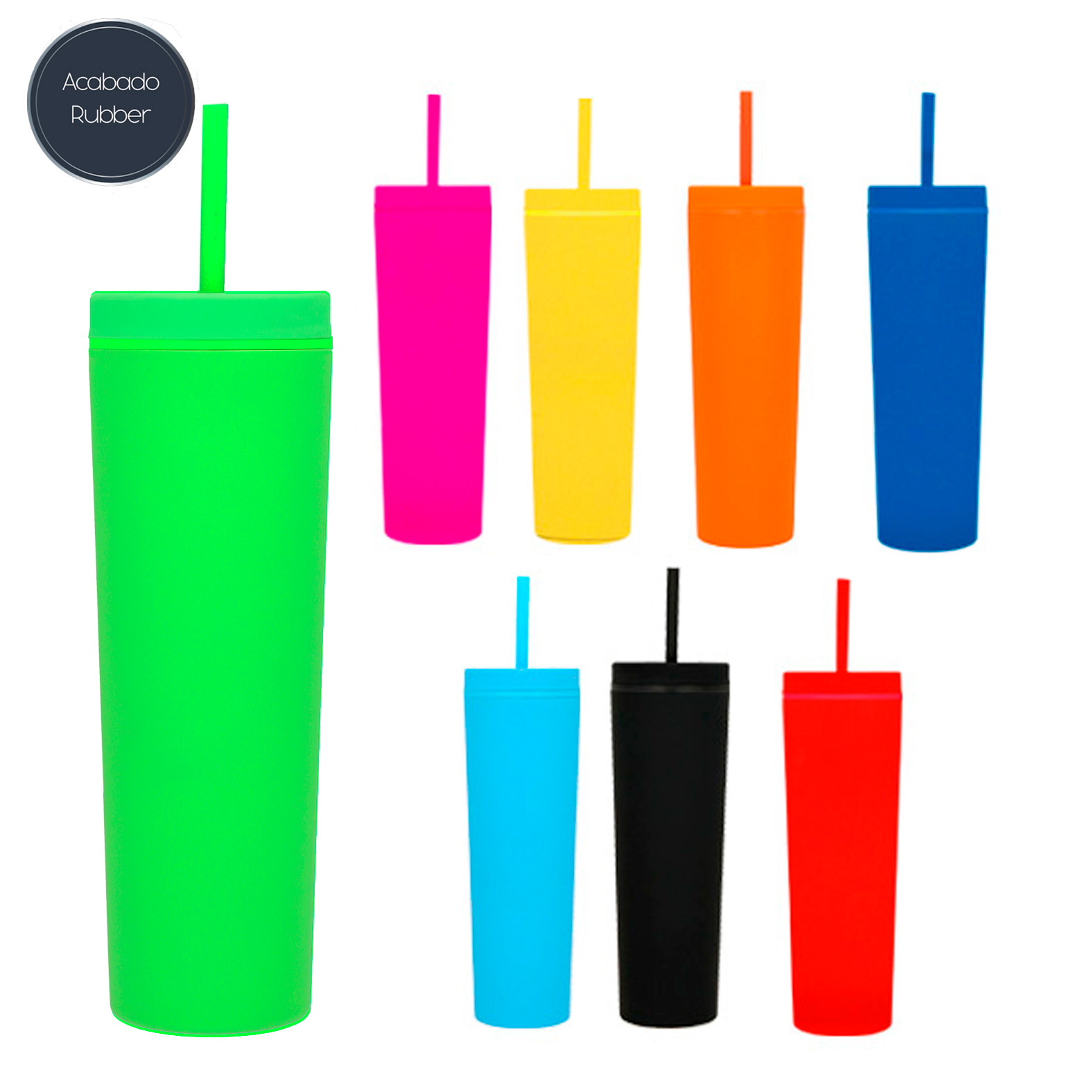 Termo de plástico con doble pared, tapa enroscable y acabado rubber. Incluye popote de plástico.