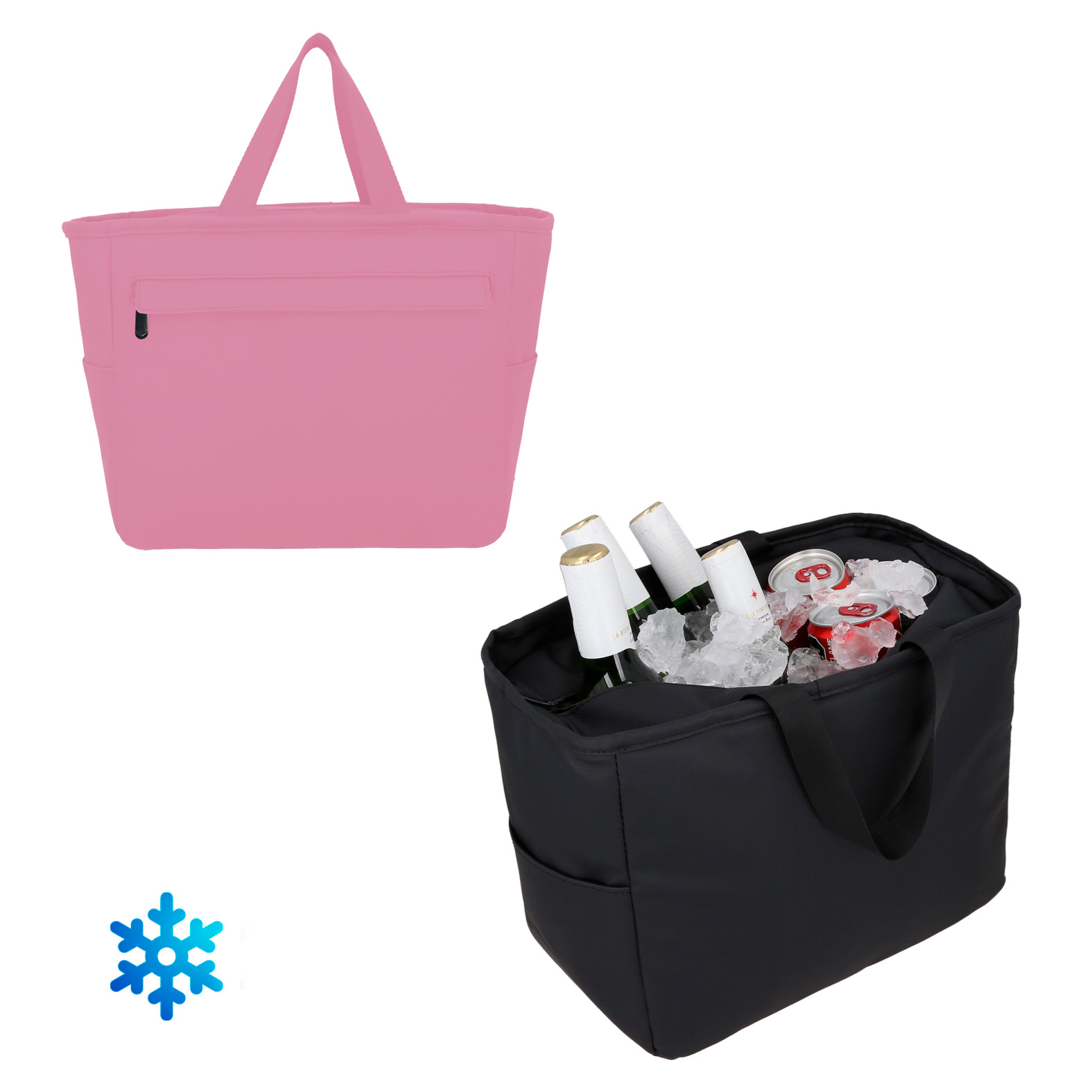 Hielera con interior impermeable, cierre, 1 bolsa frontal, 2 bolsas laterales y doble asa superior.