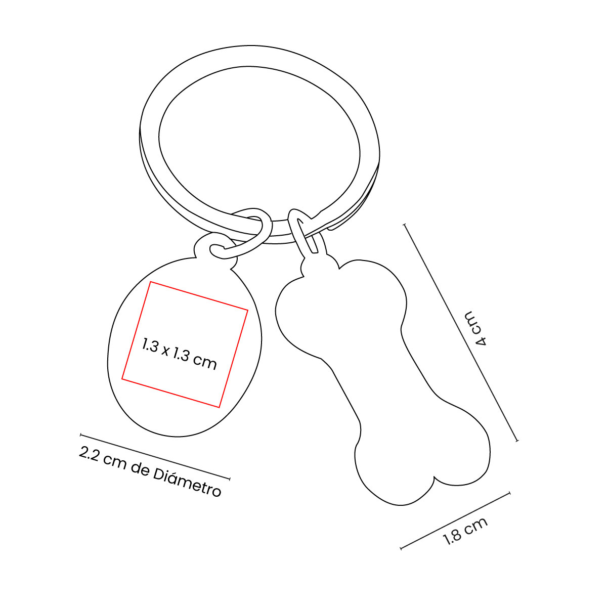 Llavero metálico con diseño en forma de hueso y placa redonda para grabado. Personalízalo con el nombre de tu mascota, una fecha especial o cualquier texto que desees. Además de mantener tus llaves organizadas, también te permite recordar a tus mascotas. – M 7981