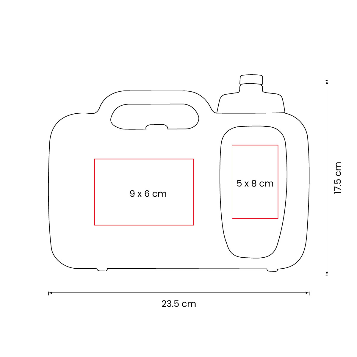 Divertido contenedor para almacenar alimentos. Cuenta con pestañas de cierre a presión para asegurar su contenido. Esta lonchera posee dos áreas distintas: Una dedicada a colocar los alimentos y otra, destinada a un cilindro de plástico ya incluido. Por su parte, el cilindro cuenta con sistema de rosca twist-off, que permite abrir y cerrar la tapa en un giro. Además, este cilindro dispone también de una válvula de seguridad para evitar derrames. No apto para bebidas calientes. No introducir en microondas. – KTC 007