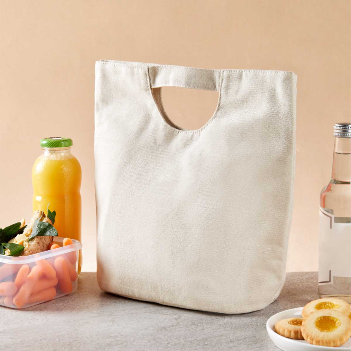 Lonchera con asa de mano y fuelle en la base. Incluye broche imantado para cerrar. Interior metalizado. Capacidad para 4 latas. – SIN 273