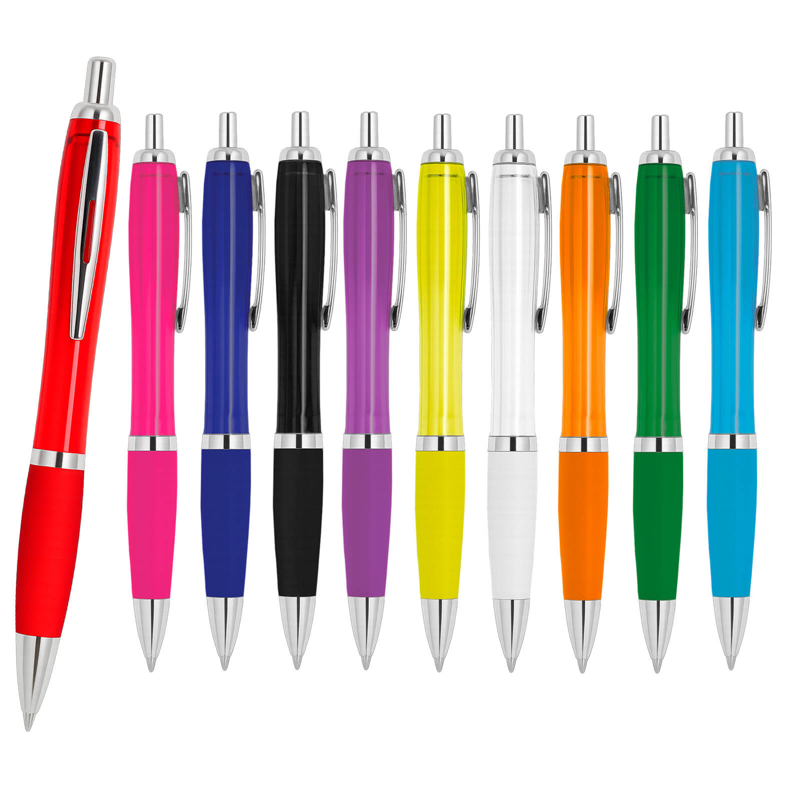 Bolígrafo de plástico traslúcido con clip metálico y grip de goma.