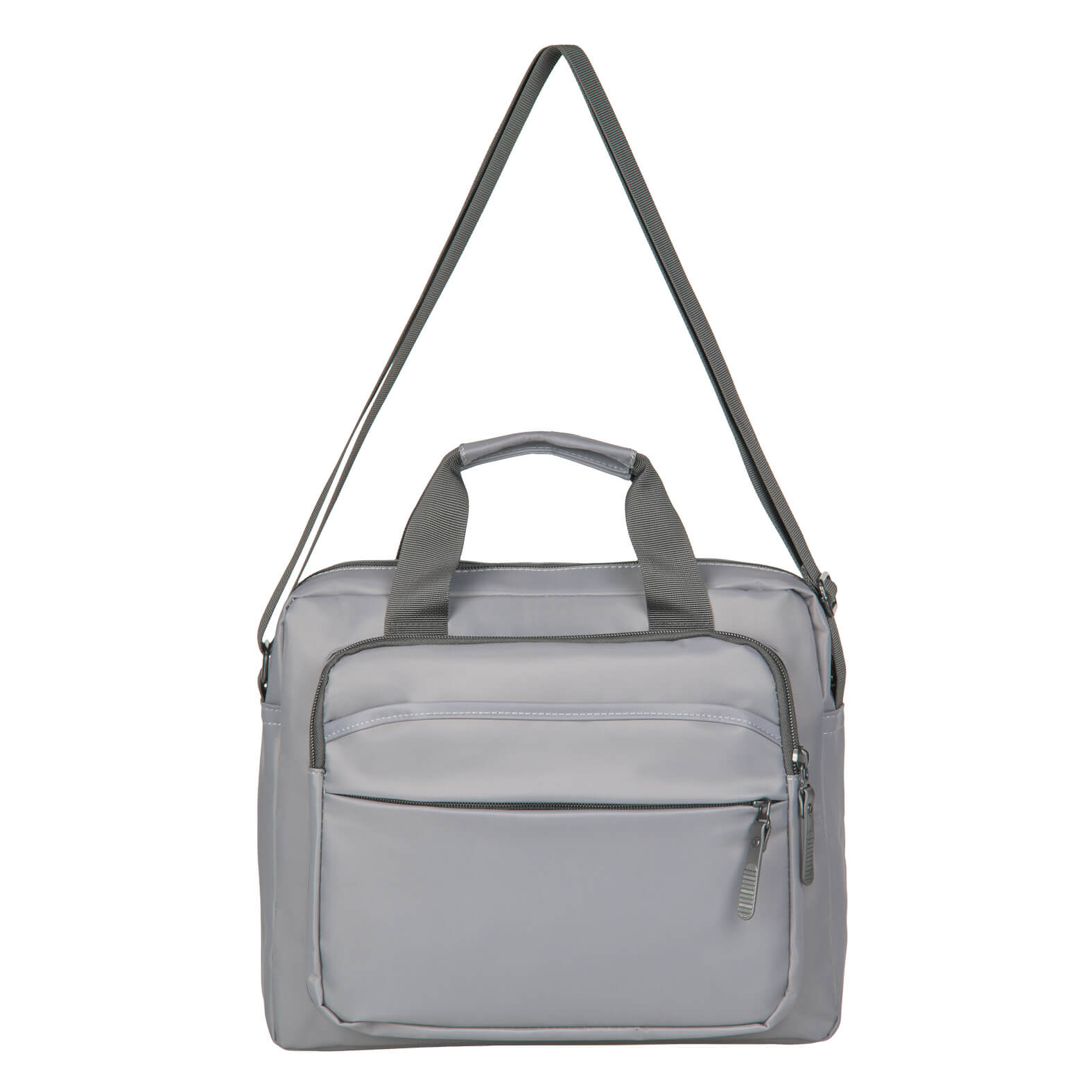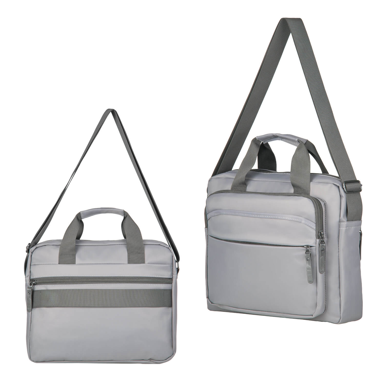 Portafolio con compartimento principal para laptop de hasta 15″, bolsa interna con cierre, dos bolsillos frontales con cierre, uno de fácil acceso, bolsa trasera con cierre, banda carry-on, asas y correa ajustable.