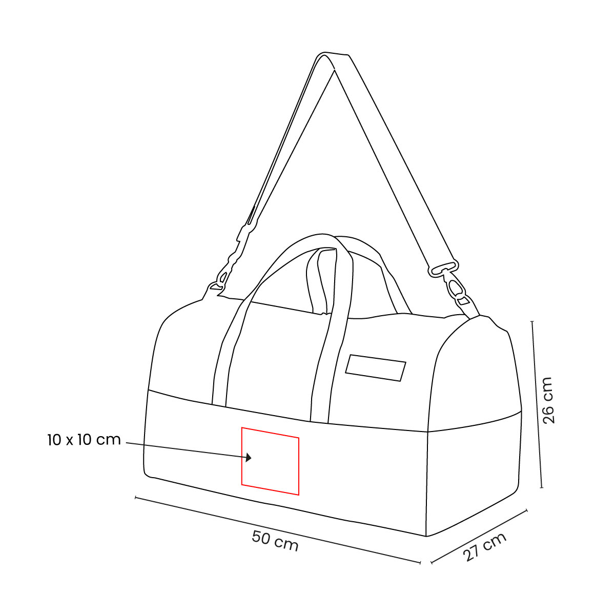 Maleta que destaca tanto en diseño como en estilo. Es ligera y ecológica, hecha de algodón reciclado. Compartimento principal con cierre y base de cartón removible. Incluye asa ajustable removible para hombro. – SIN 883