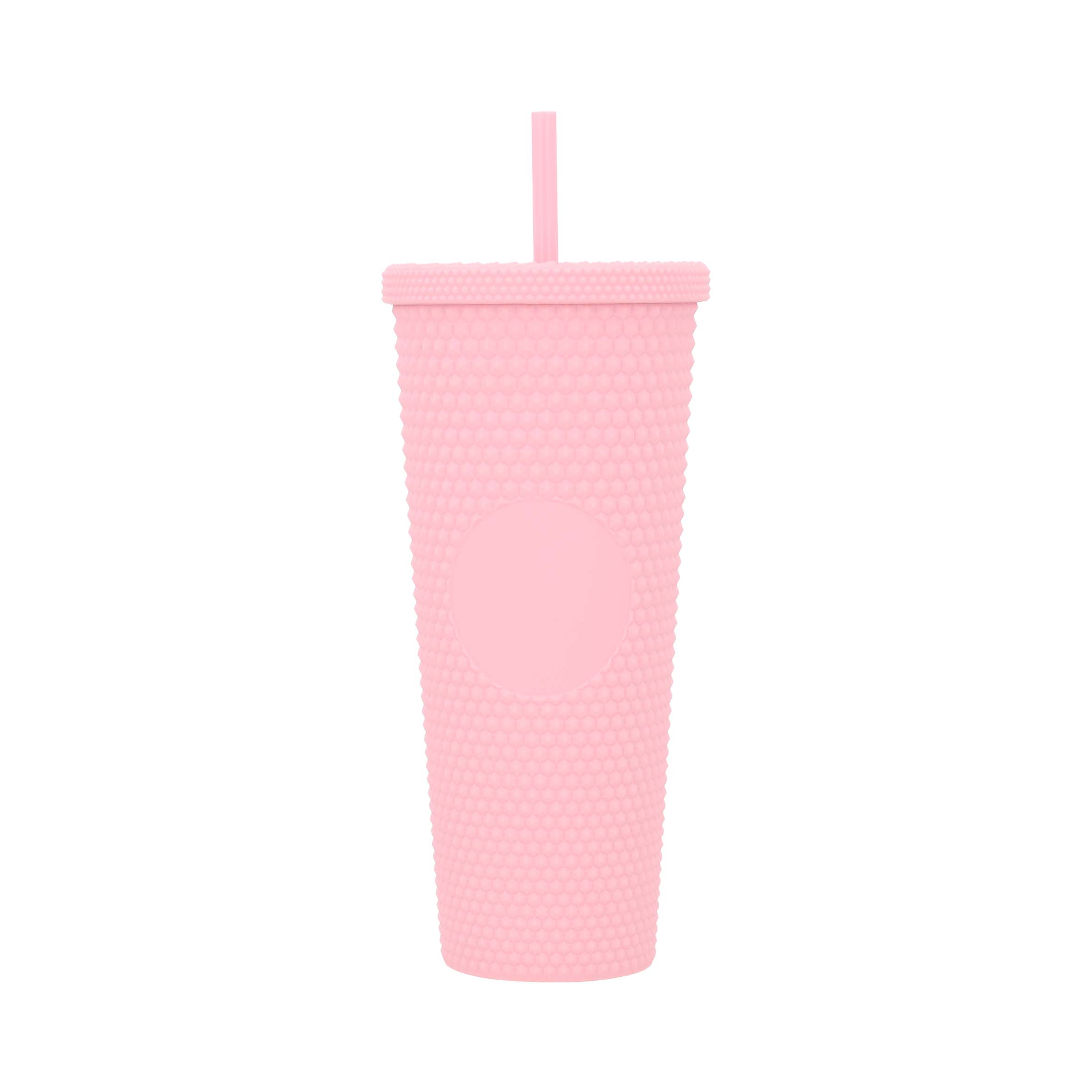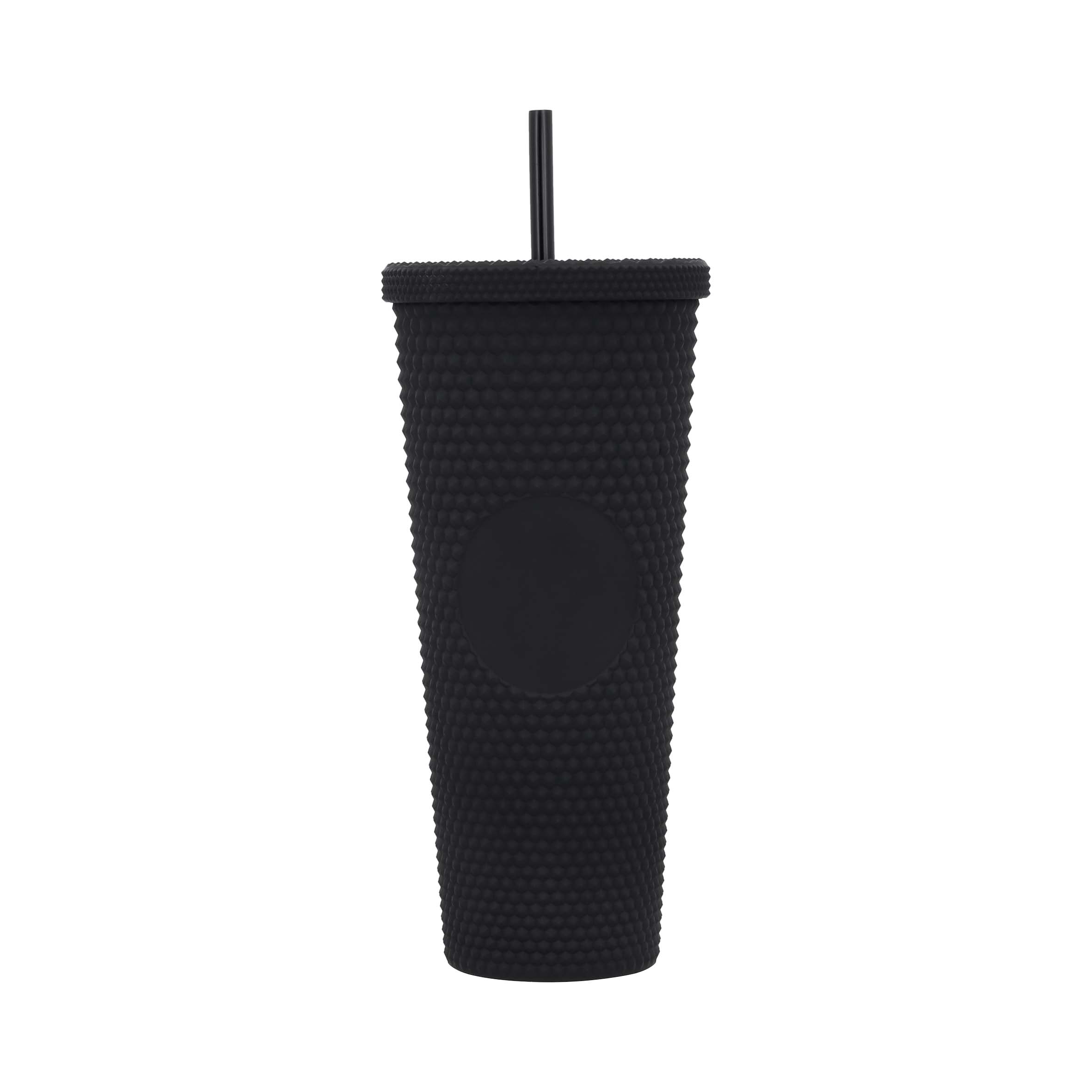 Vaso con doble pared de plástico, textura, tapa enroscable y popote incluido.