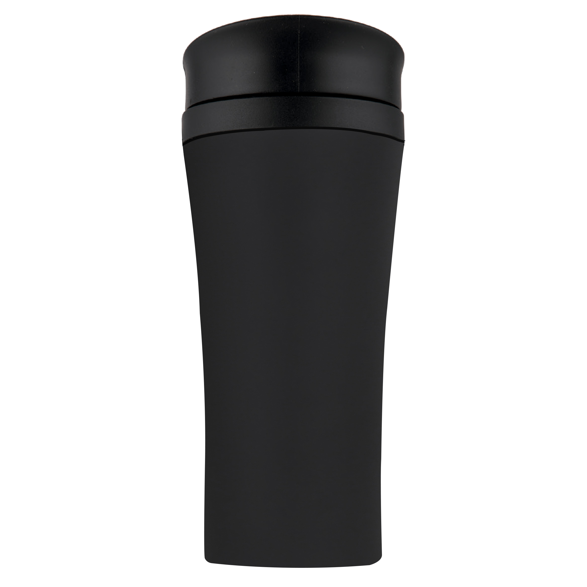 Termo con doble pared de acero inoxidable, tapa hermética enroscable y botón de seguridad para evitar derrames.