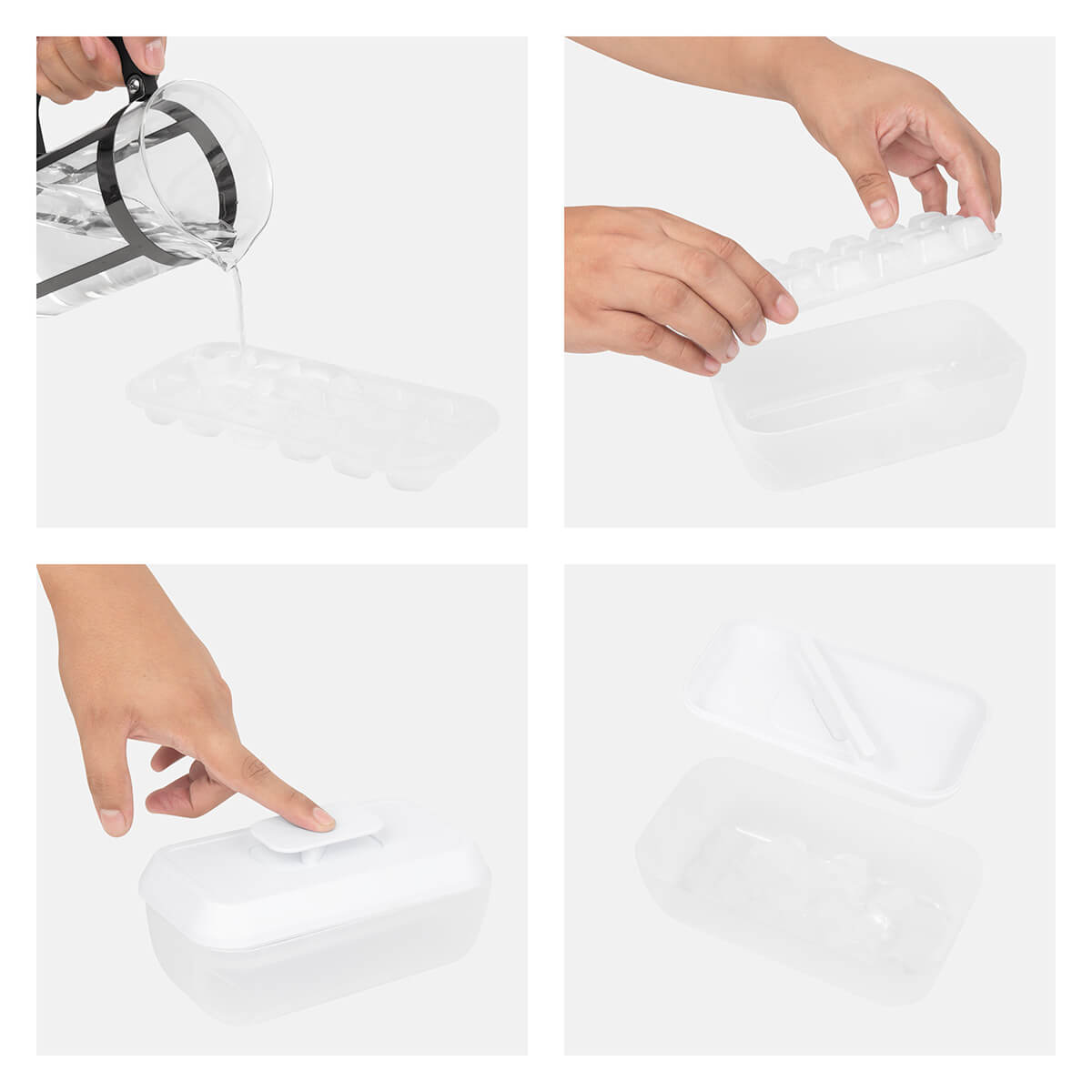 Molde para hielos con almacenamiento integrado. Crea hasta 18 cubitos y desmóldalos fácilmente con el sistema push de la tapa. Gracias a su contenedor integrado, puedes almacenar el hielo listo para usar sin ocupar espacio extra. – KTC 975