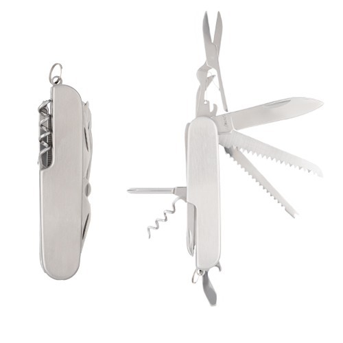 Navaja metálica multiusos con 11 funciones que contiene: navaja, sacacorchos, 2 destapadores, 1 con punta plana, escariador, tijeras, sierra, descamador con quita anzuelos, desarmador de cruz, lima con limpia uñas, enhebrador de agujas y arillo para usar como llavero.