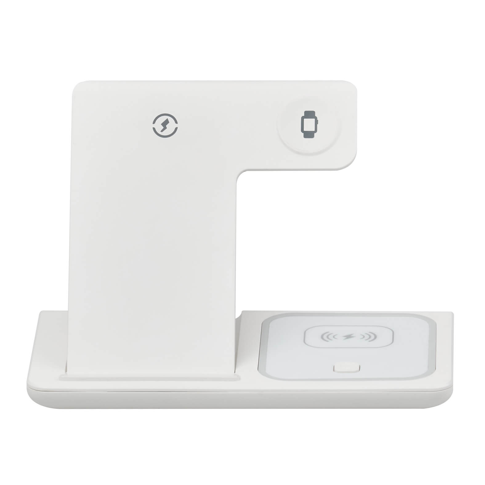 Multicargador inalámbrico plegable 3 en 1 para smartphone, audífonos y reloj inteligente. Cuenta con botón para luz e incluye cable de carga Tipo C. Compatible solo con dispositivos con tecnología Qi.
