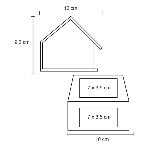 Estuche ecológico rígido en forma de casa que contiene block de notas y banderas adhesivas de colores.