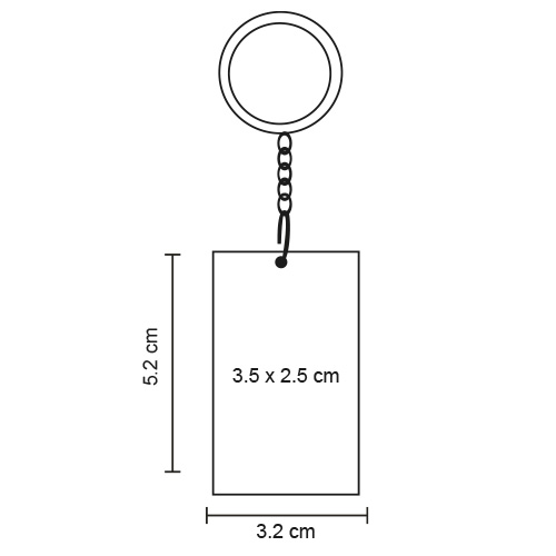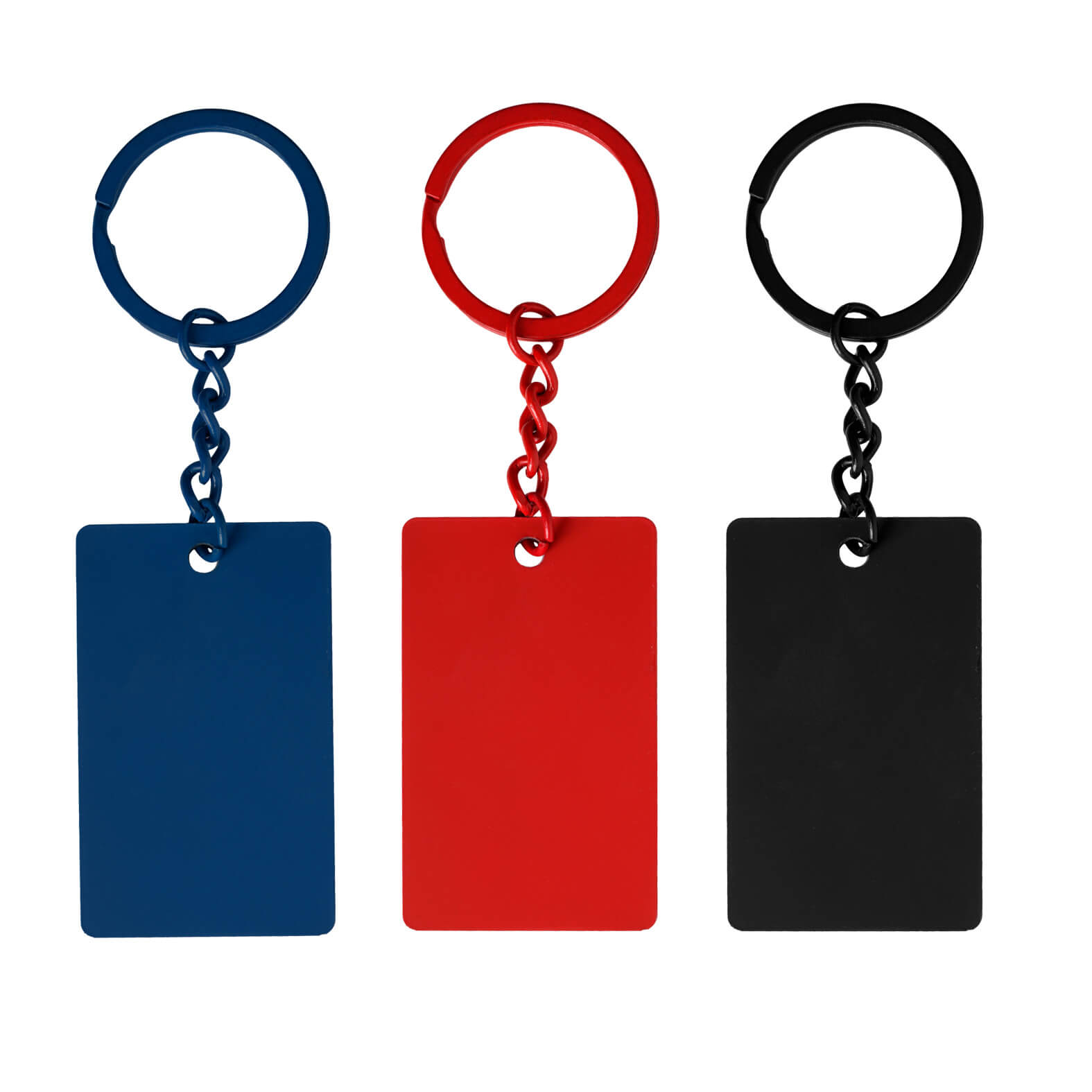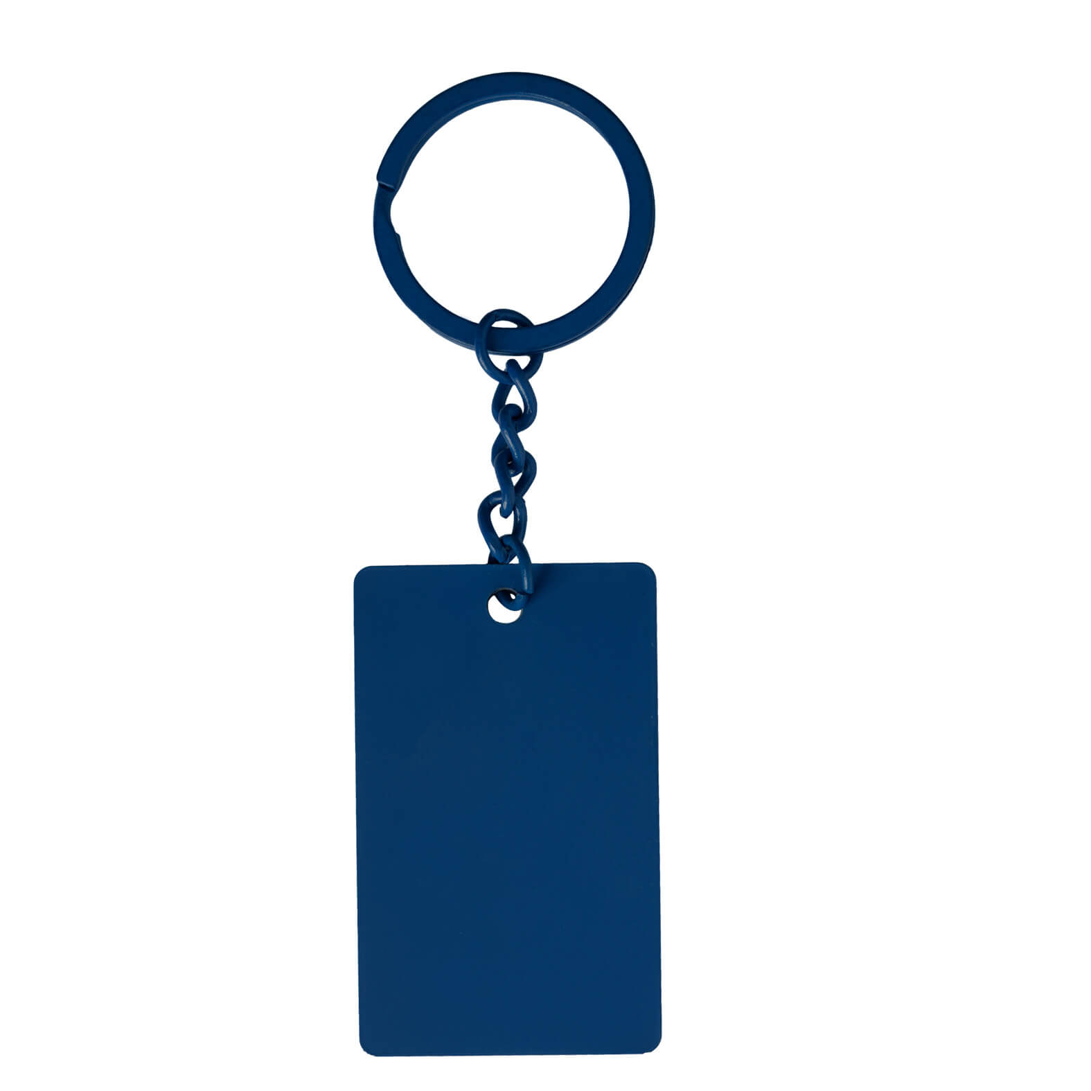 Llavero con placa rectangular de color sólido, acabado rubber, orillas redondeadas y aro reforzado.