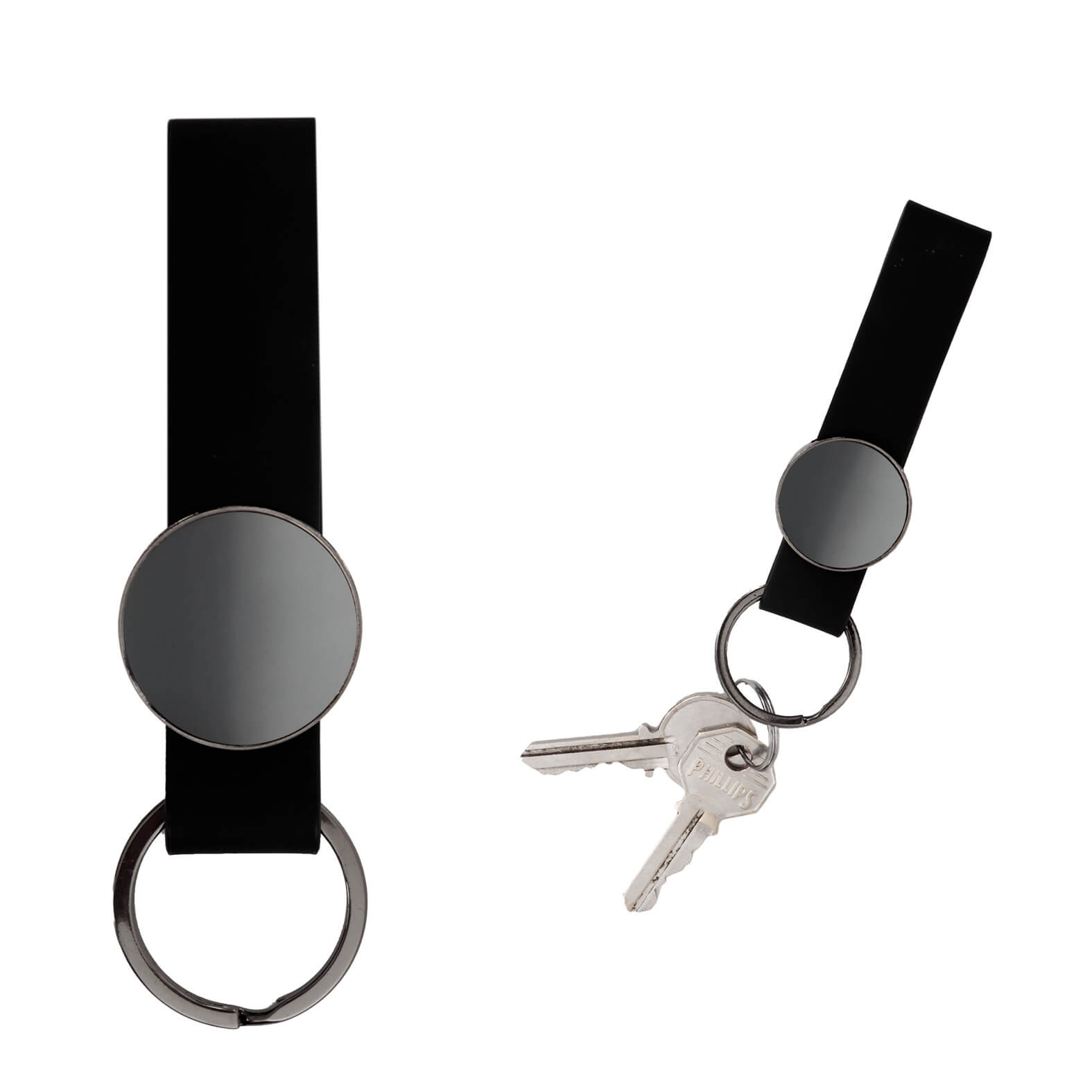 Llavero metálico con correa de curpiel y círculo con acabado espejo.