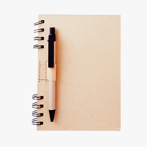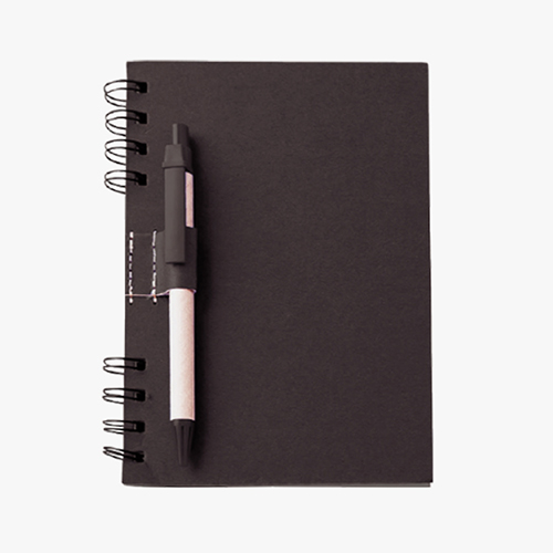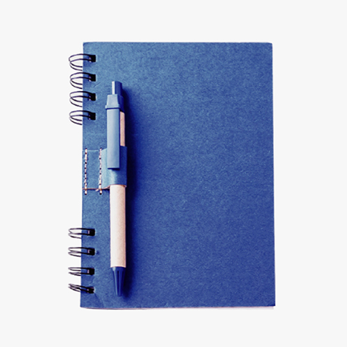Libreta de papel reciclado con bolígrafo, incluye: 70 hojas rayadas.