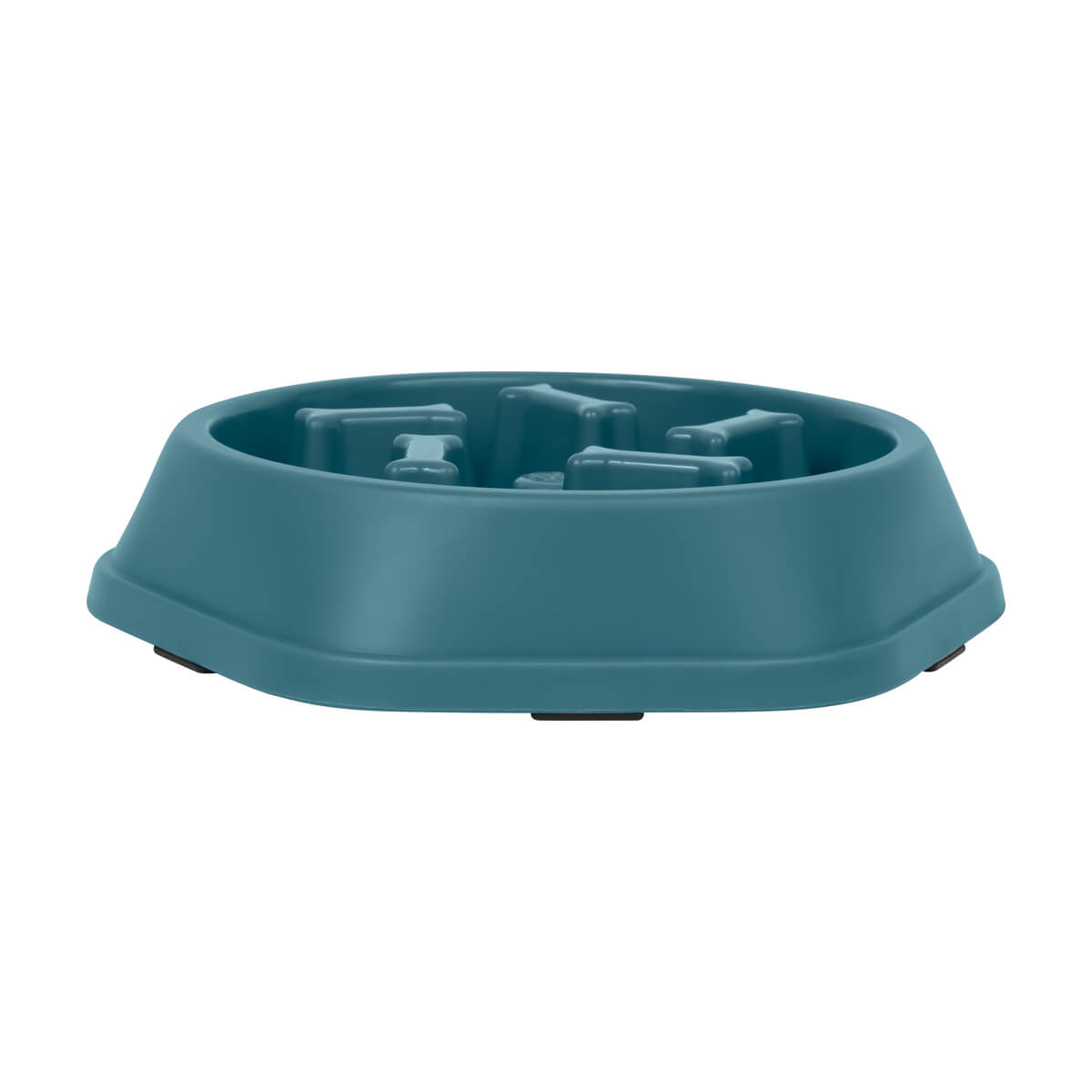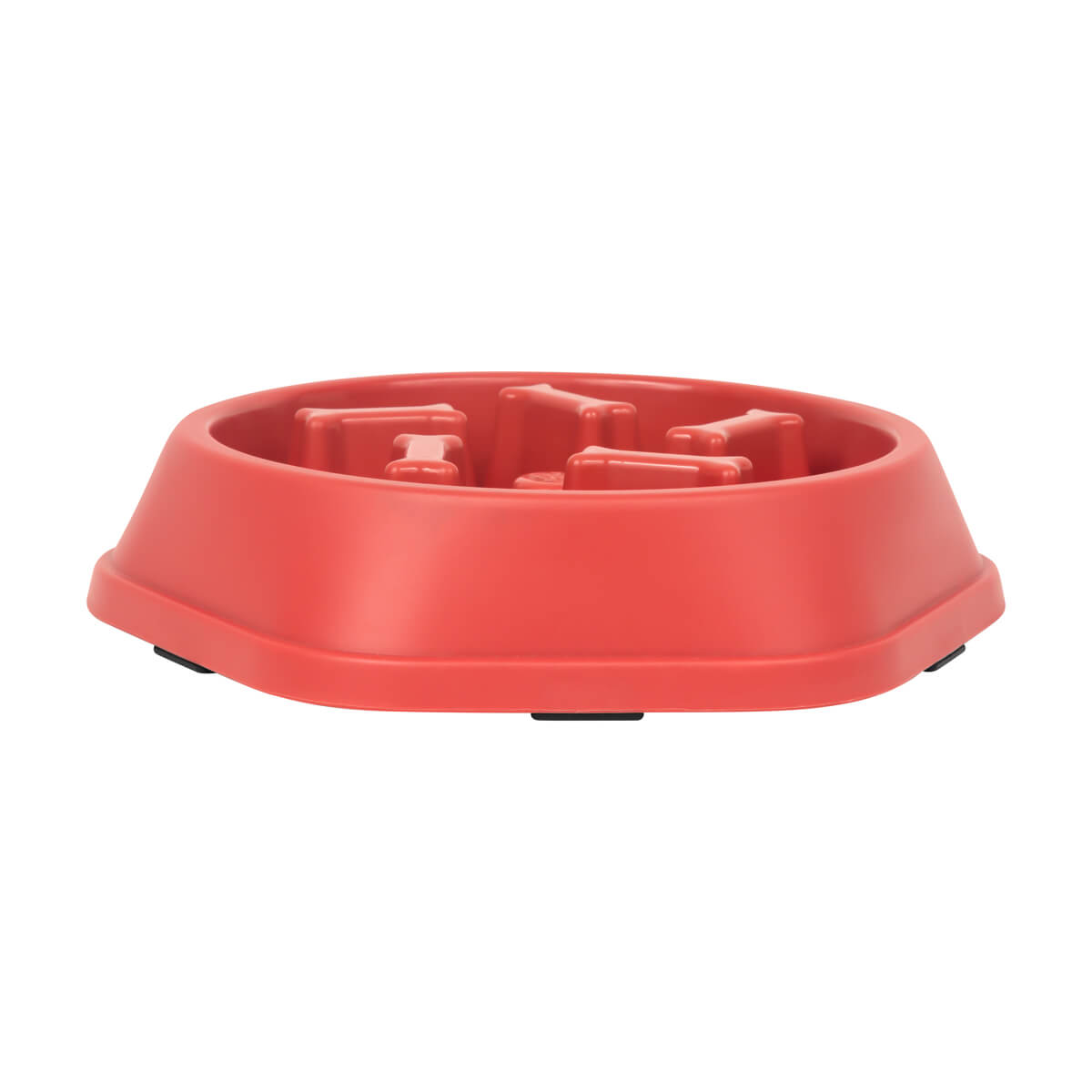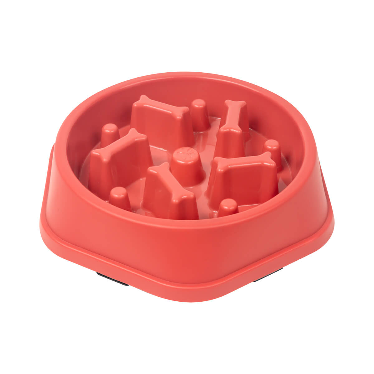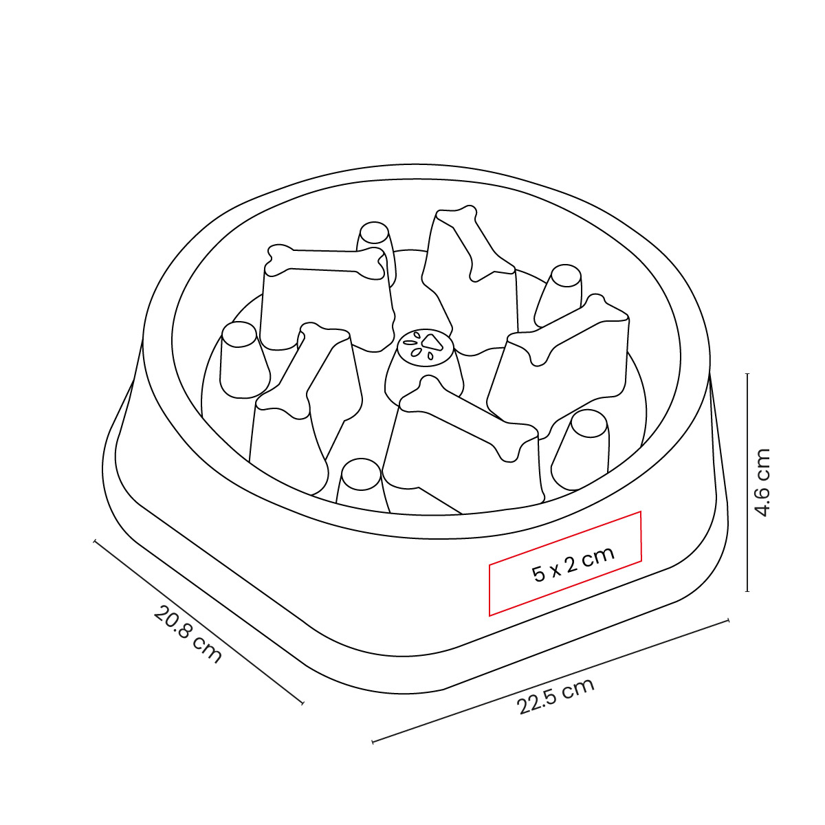 Plato de alimentación lenta para mascotas, fabricado en plástico de grado alimenticio. Ideal para perros pequeños y medianos. Su diseño interior con figuras de hueso ayuda a reducir la velocidad al comer, favoreciendo una digestión saludable. Su base cuenta con seis almohadillas antideslizantes, que evitan deslizamientos durante su uso. – PET 010
