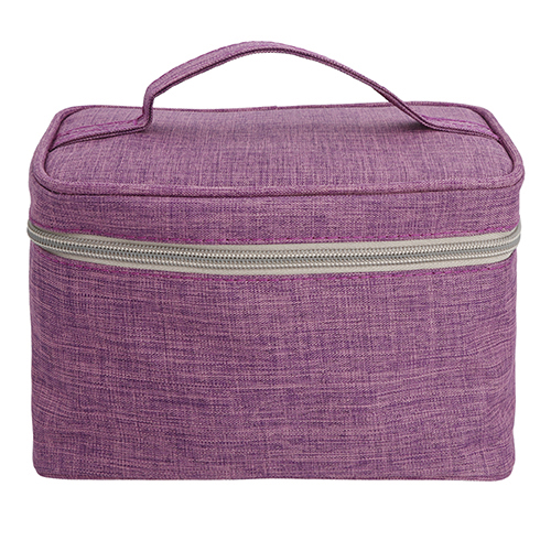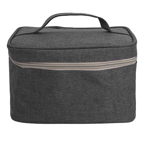 Cosmetiquera de poliéster en forma rectangular con dos compartimientos y asa.