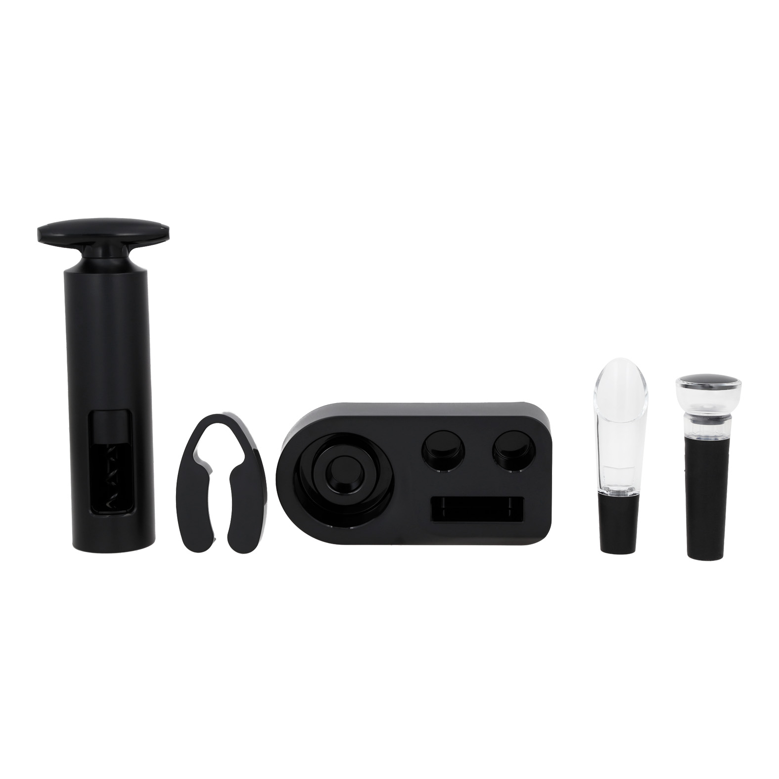 Set para vinos que incluye: 1 decantador, 1 corcho de sellado al vacío, 1 corta etiquetas, un destapador manual y 1 base para los artículos.